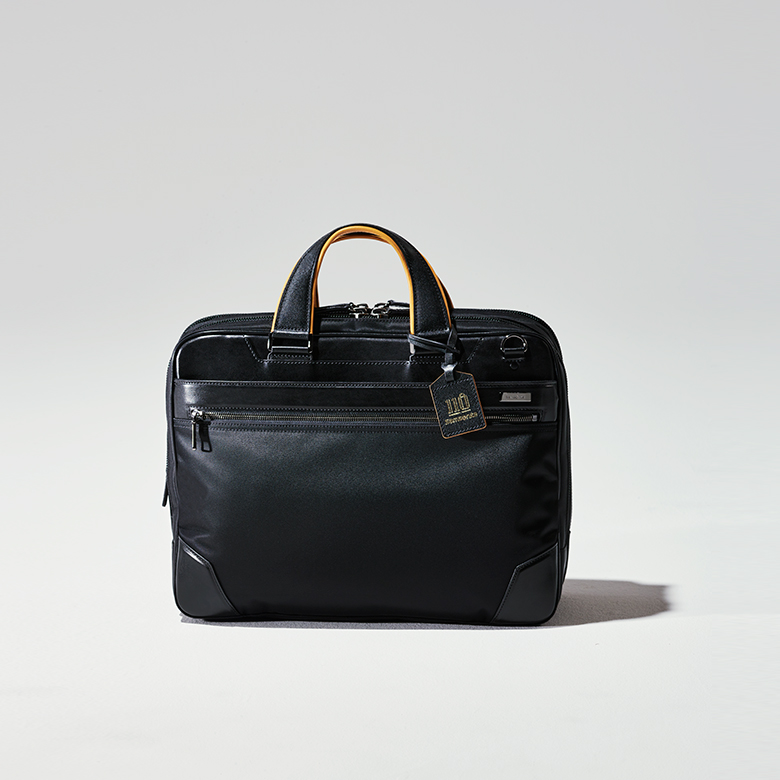 サムソナイトのビジネスシリーズからのリミテッドモデル。はっ水ナイロン地のボディーに、110周年限定モデルではイエローゴールドの差し色がポイントになっている。他にバックパックと3WAYタイプも発売される