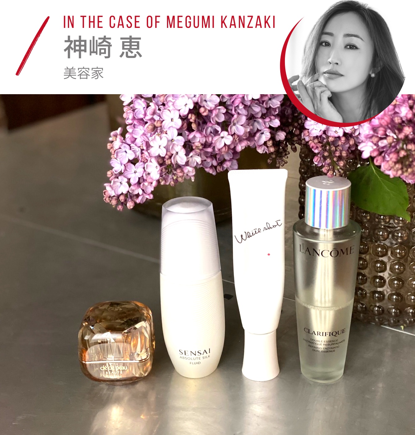 「家の中でも乾燥はしますし、マスクの着用で肌は摩擦刺激を受けていますから、普段以上に保湿を心がけています。肌の再生を期待できる酵素に着目した『ランコム(LANCOME)』の化粧水をたっぷりと。『ホワイトショット(WHITESHOT)』の美白乳液は気になる箇所に重ねづけ。家で過ごし、例年よりも日差しを浴びる時間が短い今こそ、美白の頑張りどきです。左の2点、乳液とクリームは柔らかさとハリ感を両立できるので手放せません」