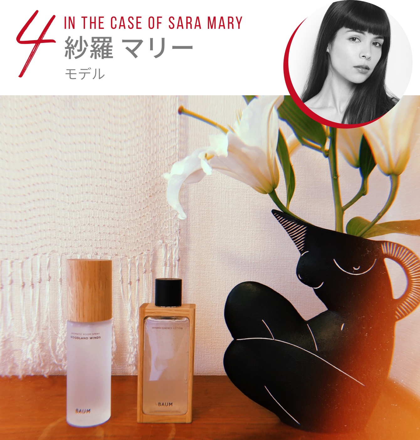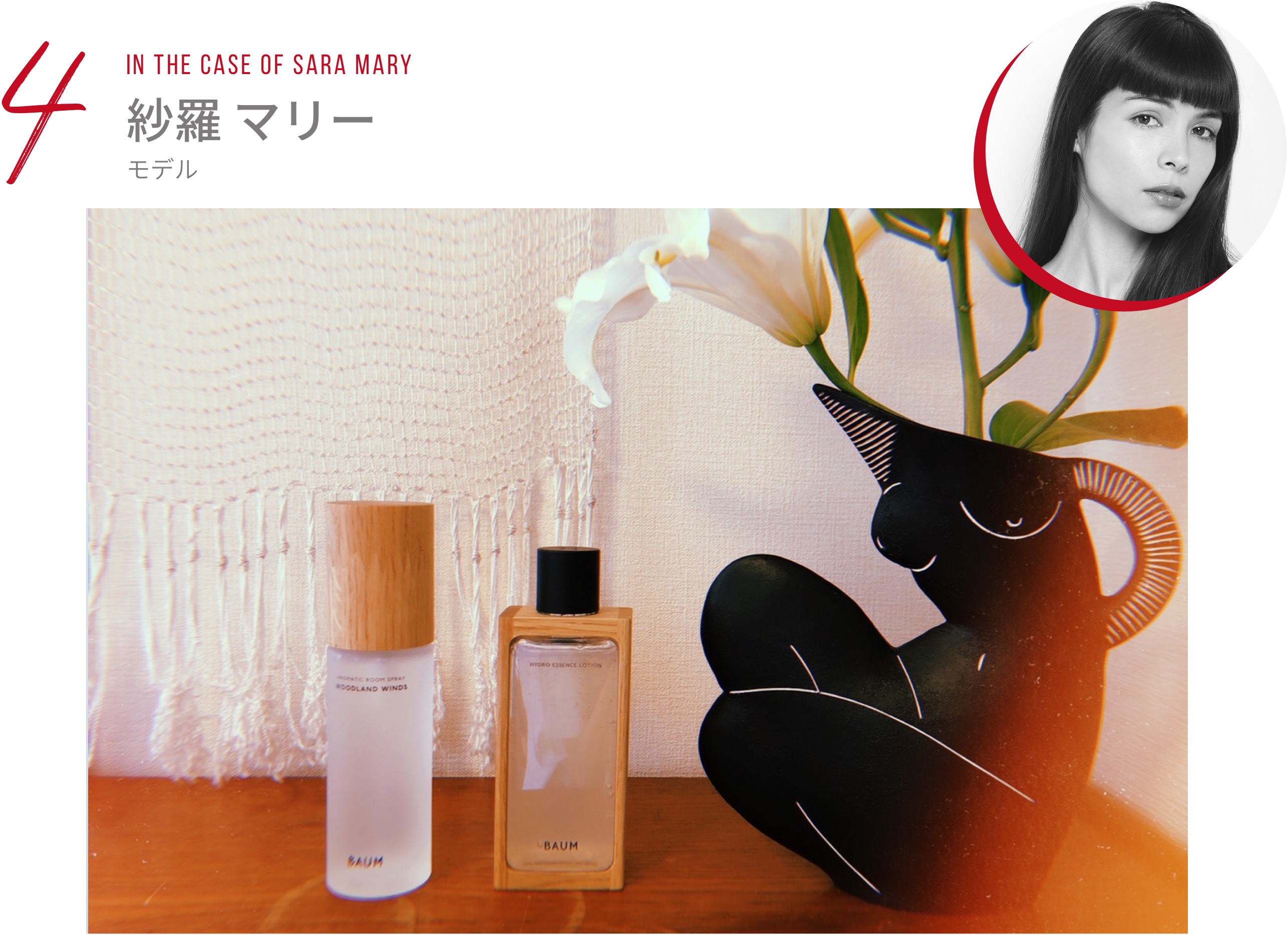 「長い家時間のなかで精神的な安定につながっているのが、『バウム(BAUM)』の『アロマティック ルームスプレー』と化粧水の『ハイドロ エッセンスローション』。“樹木との共生”をテーマに掲げるサステナブルな新ブランドとしても注目しています。ルームスプレーは、優しいながらも凛とした香りで深呼吸を促してくれます。化粧水のもっちりとした仕上がりもお気に入り。おうちにいながら森林浴の気分に浸っています」