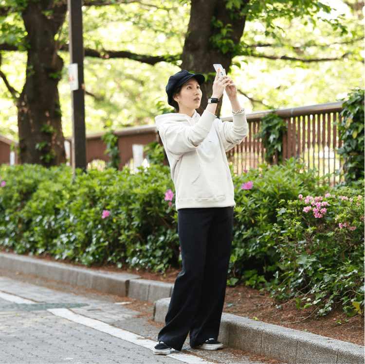 「中目黒は私のお気に入りの街。昼間に目黒川沿いをゆっくり散歩しながら過ごしたり、ショッピングしたり、なんでも楽しめるステキな場所です。おいしいお店がたくさんあるのもポイントが高いですね。デートの時は、普段通りのカジュアルスタイルが私流。ただ、時計は一生大事にできる上質なものをずっと使っていたい派です。トレンドを追うよりも自分の軸を持っていたいので、それが服装にもデザインの仕事にも表れているのかも」