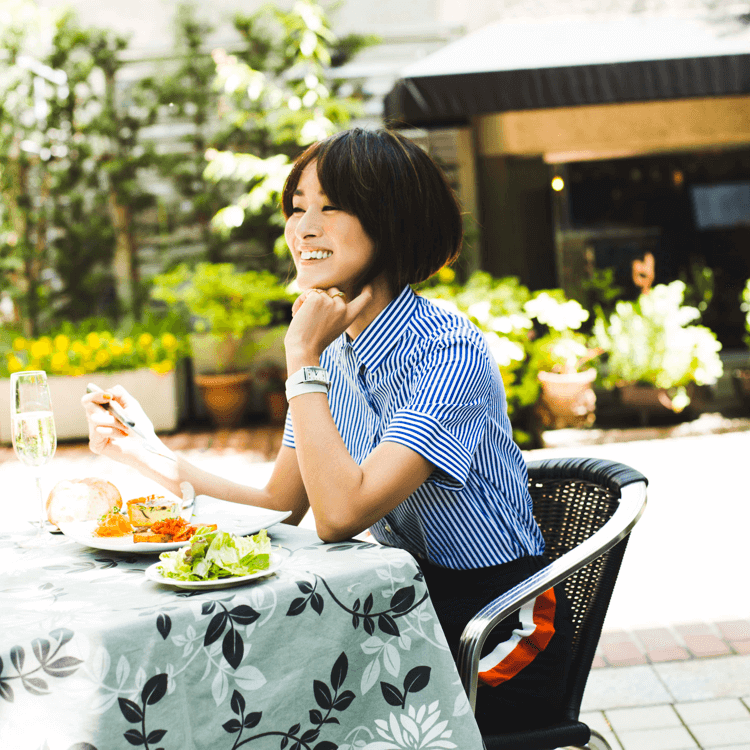 「代官山にあるフレンチ料理店で、主人とよくランチデートをしています。お気に入りのメニューはフワッフワのキッシュが美味しいランチプレート!肩の力の抜けたスポーティなスタイリングで、気負わないデートタイムを楽しみたいです。この時計はフェミニンだけどシャープな印象もあって、とても素敵。母、モデル、執筆業と忙しいですが、プライベートな時間を有意義に過ごすためにも、こんな風に上質な時計を身に着けていたいなと思います」