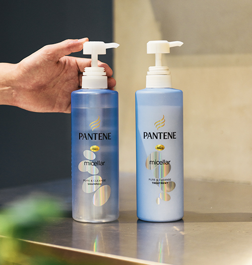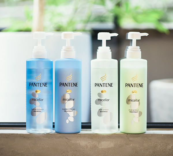 ミクロクレンジング「ミセラー粒子」配合で、髪と地肌の毛穴の中のミクロの汚れまでマグネット吸着するパンテーン「ミセラー」シリーズ。(左)軽やかな洗い上がりのすっきりタイプ。パンテーン ミセラーシリーズ ピュア&クレンズ シャンプー/トリートメント (500mL/500g) ¥898 (編集部調べ) (右)リッチなテクスチャーのしっとりタイプ。同 ピュア&モイスト シャンプー/トリートメント (500mL/500g) ¥898 (編集部調べ)