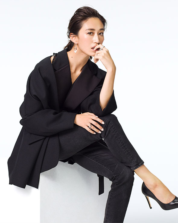 程よい色落ち具合がサマになるブラックデニムに、オーバーサイズのジャケットを合わせたモードな着こなし。太ベルトでウエストマークすれば全体のシルエットが引き締まり、トレンド感もばっちり。「ジャケットを合わせたシャープな着こなしが新鮮。動きやすい素材は、世のママたちにも優しいですね!」(神山まりあ) デニム “アニバーサリー” [39403-akb] 1万9000円/レッドカード(ゲストリスト 03-6869-6670)、コート 7万9000円/ザ ケイジ(イジットアンドコーリミテッド 表参道 03-3499-7355)、インナーのボディスーツ 8000円/インティミッシミ(エイチスリーオーファッションビュロー 03-6712-6180)、ピアス 1万8000円、リング[人差し指] 1万5000円/共にグロッセ、リング[薬指] 1万2000円/グロッセ グラッセ(以上グロッセ・ジャパン 03-5413-6039)、シューズ/スタイリスト私物