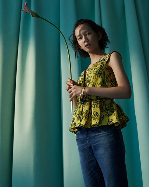 鮮やかなイエローが愛らしいペプラムトップスは、ビンテージ感のあるデニムを合わせることで甘さが抑えられ、洗練された華やかさが出る。「他のデニムとの違いは、とにかく柔らかくて動きやすいところ。初めてはいたのに、自分の脚のラインにしっかりフィットしてくれる」(中島セナ) デニム”アニバーサリー ハイライズ”[26403HR-akm]1万9000円/レッドカード(ゲストリスト 03-6869-6670)、ブラトップ 2万8000円/ルプコ(シアン PR 03-6662-5525)、バングル 4万6000円/フレーク(フレーク 03-5833-0013)、リング[3個セット] 1万円/マンデーエディション(ジェムプロジェクター 03-6418-7910)