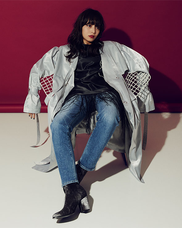 定番のブルーデニムには、遊び心のあるフォルムとツヤ感が目を引くロングトレンチでさりげなくエッジをきかせて。「デニムはシンプルが一番!普段は、わりとオーバーサイズをはくことが多いのですが、テーパードシルエットは脚をスラリとみせてくれるので、バランスよく着こなすことができますね」(Licaxxx) デニム “アニバーサリー テーパード” [71403T-kim] 1万9000円/レッドカード(ゲストリスト 03-6869-6670)、トレンチコート 8万5000円、トップス 3万2000円、ブーツ 参考商品/ヨウヘイオオノ(ヨウヘイオオノ 03-3464-7910)