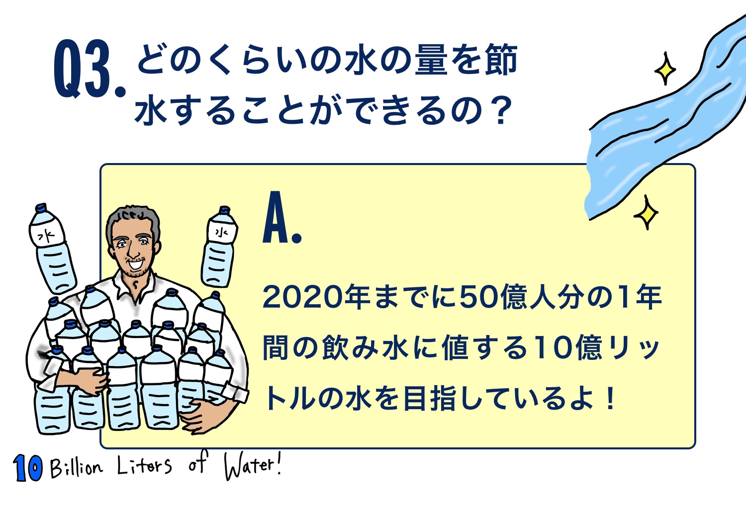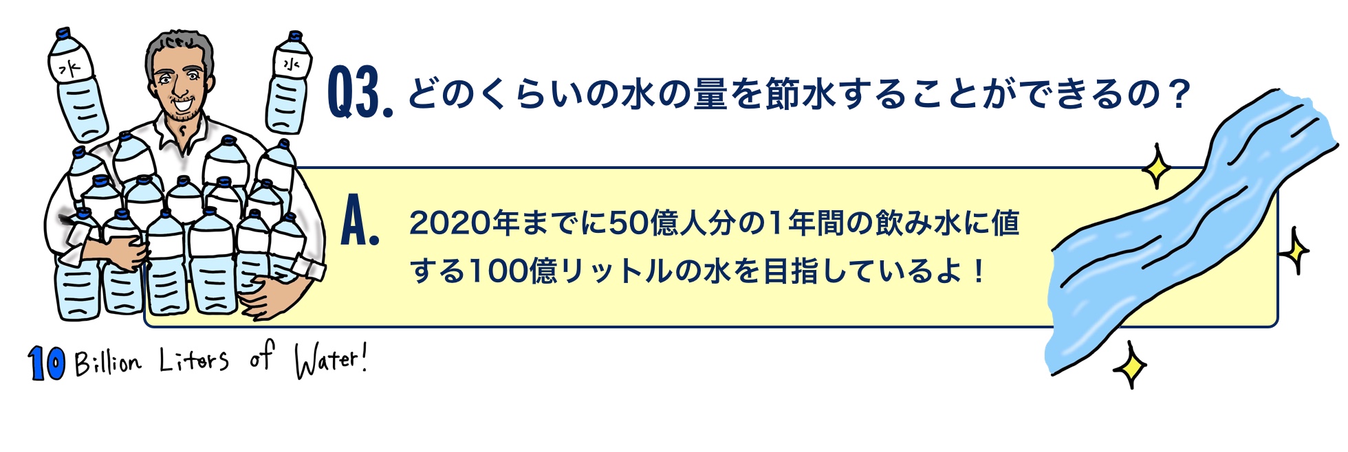 工場やサプライヤーと協力し製造工程を改善することで、2020年までに100億リットルの節水を目指している。この節水で実現できる水の量は、50億人分の飲み水に値する。15年からの3年間では24億リットルの水を節水した実績がある。またギャップ社では、商品開発やデザインする段階で水の使用量や化学薬品の使用を減らす方法を模索し、まだまだ改善の余地はあると考える。