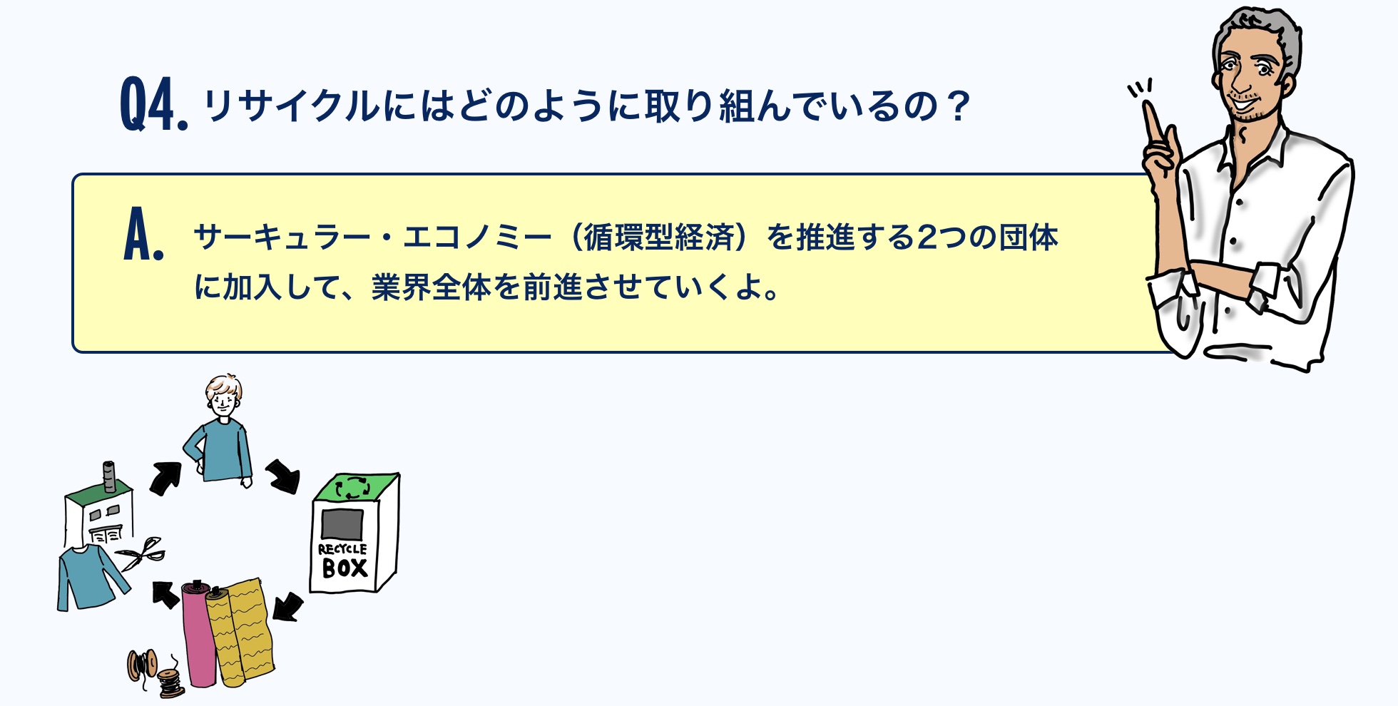 ギャップ社はグローバルファッションアジェンダによる「サーキュラー・システム・コミットメント」に加入し、エレンマッカーサー財団「メイク・ファッション・サーキュラー・イニシアティブ」のコアパートナーになっている。この取り組みに参加することで、リソースの回収、リサイクルを促進させるだけでなく、業界全体を前進させていきたいと考えている。アップサイクル素材にも着目し、ペットボトルから作られたポリエステルやナイロンなどを採用している。2017年には2500万本のペットボトルをリサイクルした実績がある。