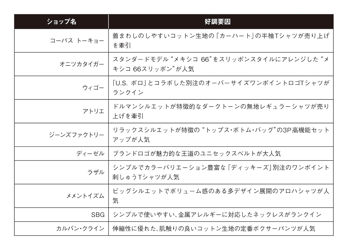 ゲームシャツはサッカーのユニフォームのような、フロント部分にロゴが入ったデザインがコーデの主役になり人気。デニムパンツやスラックスなど合わせるものを選ばずに着ることができるポロシャツや、トレンドの透け感のある素材で、レイヤードスタイルを楽しむことができる透かし編みニットが人気。かすれ感のあるプリントが古着っぽさを演出してくれるバンドTシャツも今季のトレンド。さらに、Tシャツの上からさらっと羽織り、コーデに存在感をプラスしてくれるチェックシャツ、夏のレイヤードスタイルには欠かせないレイヤードタンクトップがランクインした。