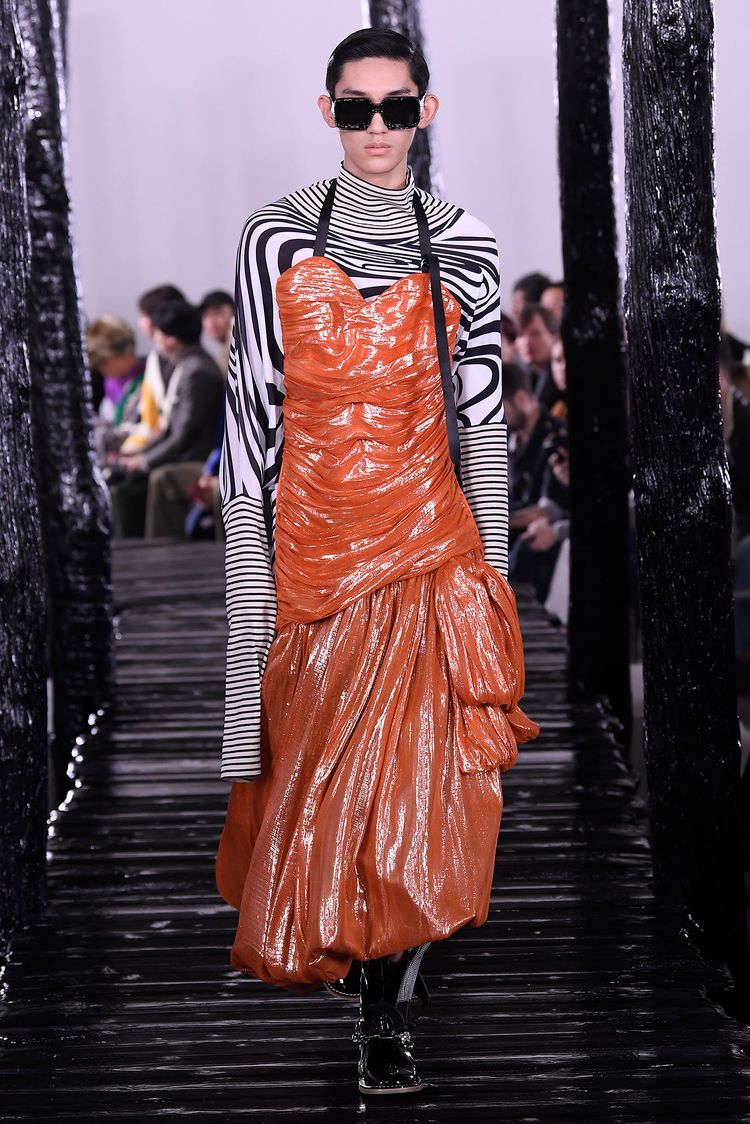 "Pretty Boy"をBGMに明るい世界観で始まったショーは、まるで太陽が思いっきり満ちたようなパワフルなエネルギーに溢れた雰囲気。まさに今回のパリの天気のような「ロエベ」2020-21年秋冬メンズ・コレクションがスタートしました。フェミニンの雰囲気も強めな今回のコレクションで印象的だったのは、女性のドレスっぽく見える、とても煌びやかなエプロンを身に纏ったルック。また象をモチーフにした「ロエベ」の代表的なバッグは、キラキラにデコレーションされていてすごく素敵でした。