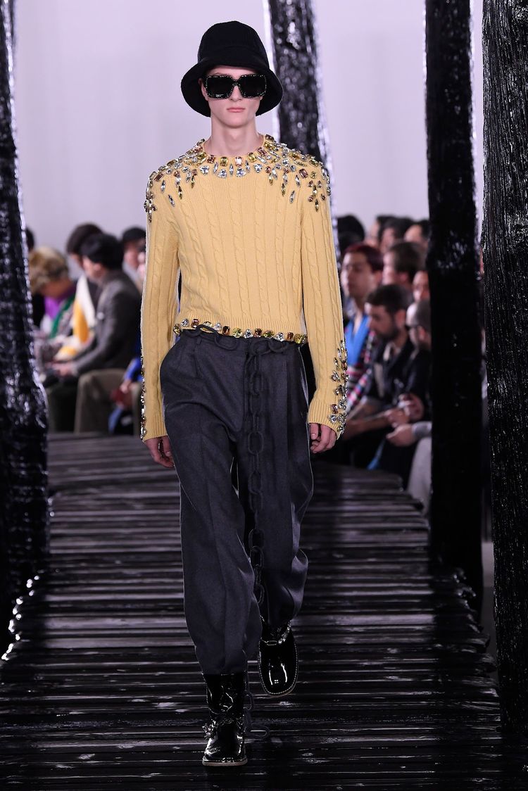 個人的に「これは気になる!」と思ったアイテムは、ハットとバケットの中間のような小さめの帽子。こちらもちょっとした装飾が幾何学的にあしらわれていてすごく可愛く、自分もワンポイントにかぶってみたいアイテムです。クリエティブディレクター、ジョナサン・アンダーソン(Jonathan Anderson)の「ロエベ」は素敵な色づかいが特徴。首元と袖に輝くストーンが装飾された鮮やかな黄色のニットは、ショーが終わっても頭のなかに強烈に印象に残るアイテムでした。