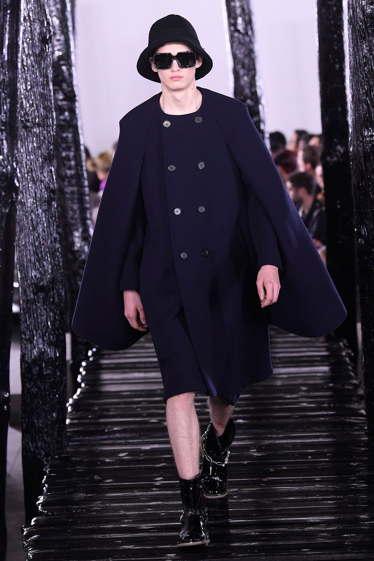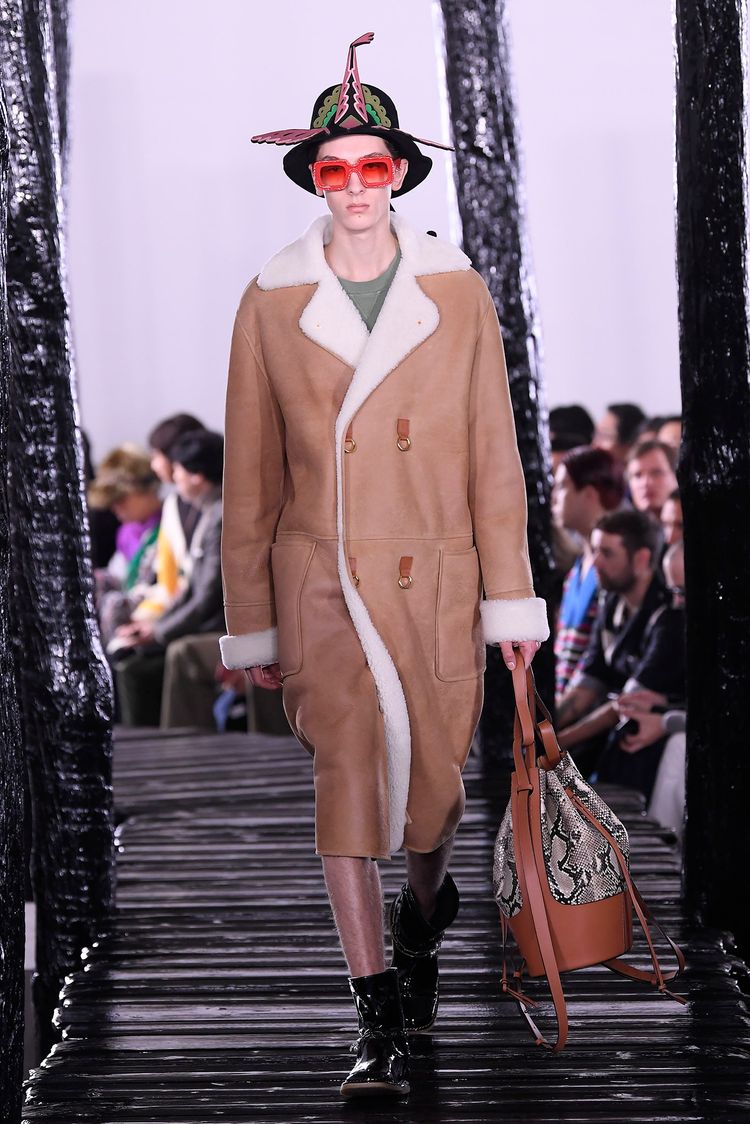 キャメルのカラーが「ロエベ」らしいロングコート。白のモコモコが絶妙なバランスを生んでいて、王道感を抱きます。今回のショーで頻出していた、このハットも印象的で見逃せません。