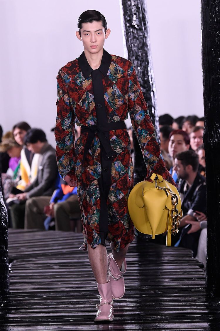 女性のワンピースのような雰囲気の総柄のルックは、個人的に好きな感じ。レトロなムードもありますが、ショーの中では異色の存在となりパンチが効いていました。何よりモデルが持つ真っ黄色の象のバック。可愛すぎます。