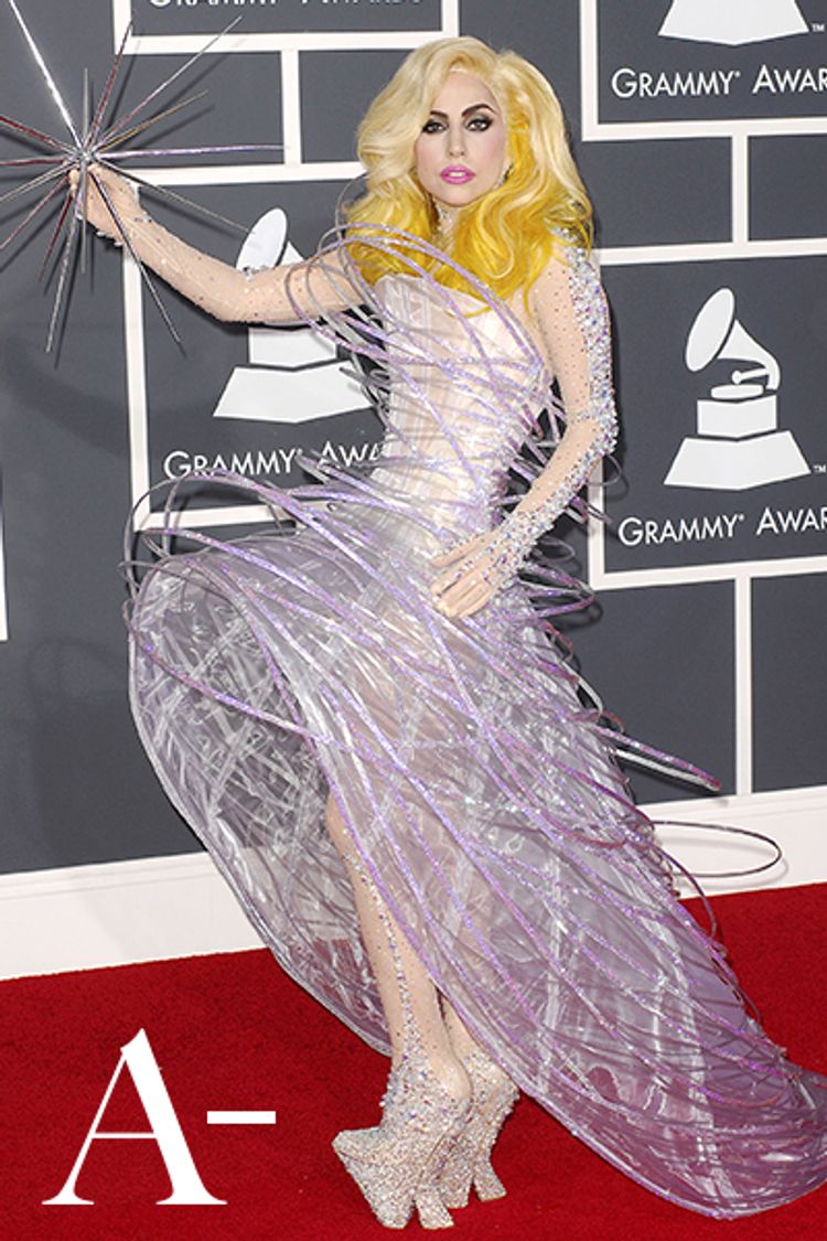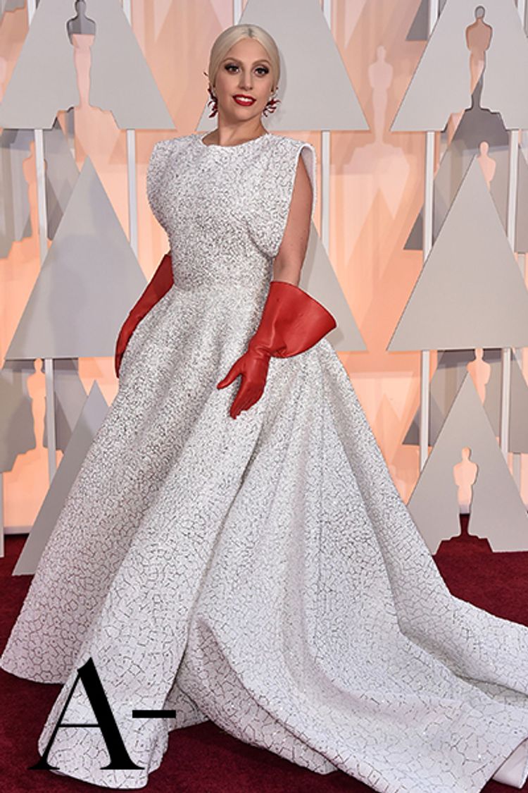 ガガはポップス界の大スターからハリウッドのトッププレーヤーへの路線変更をほのめかし始めた。「アズディン アライア(AZZEDINE ALAIA)」のカスタムドレスは、映画に出てくる美女を思い起こさせる。赤いグローブには引き締め効果もあって、とてもガガらしいファッションだ。