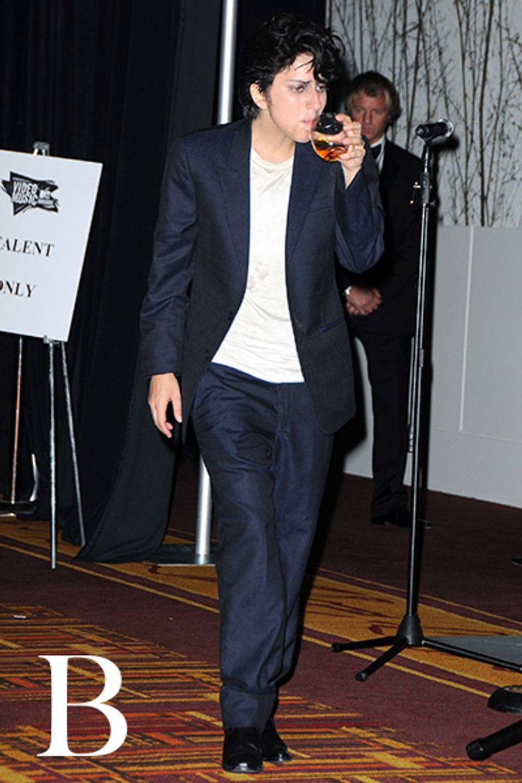 レディー・ガガの男性の分身であるジョー・カルデローネ(Joe Calderone)は、無造作にかき上げたヘアスタイルともみあげ、そして夕方に伸びてくる無精ひげが印象的だ。オフィスでの歌姫の一日といったところか。男性の姿に扮したガガのドラァグキング・ファッションはレッドカーペッド上でのベストとは言えないが、彼女の守備範囲の広さが感じられる。