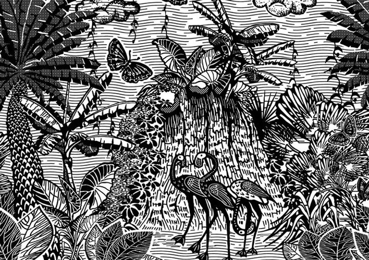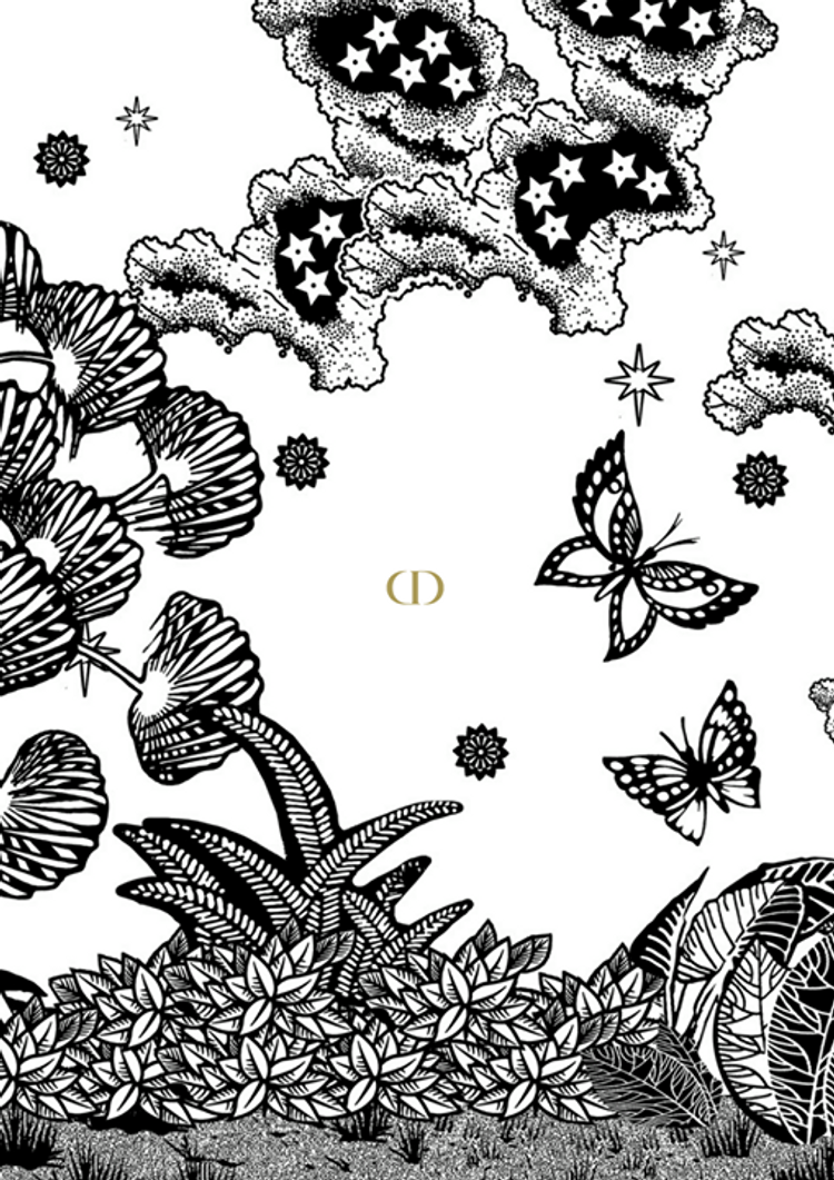 “塗り絵”は、メゾン創設者であるムッシュ・ディオールの「素敵でささやかな偶然が、アイデアを活性化させるのです」という言葉になぞらえて制作。生い茂る熱帯植物の中に野生動物が潜むジャングルは、マリア・グラツィア・キウリ(Maria Grazia Chiuri)が手掛けた2020年クルーズ・コレクションで用いたグラフィックで、仏の伝統的な生地“トワル ド ジュイ(Toile de Jouy)”のパターンを大胆に再解釈されたもの。
