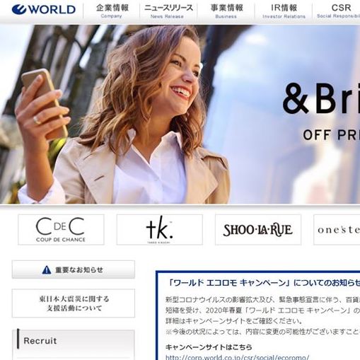 ワールド2020-21年秋冬は在庫を30%圧縮 新型コロナ禍でリスク回避を最優先