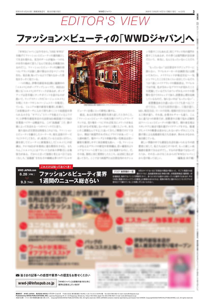 詳しくはリニューアル最初の来週号、本腰を入れてファッションとビューティの融合を説く特集内で解説するが、今回の取材では「プロダクト・セントリックからカスタマー・セントリック」と「カスタマー・ジャーニー」、そして「ユーザーメリット」という言葉を何度も聞いた。いずれも「愛」を商品や売り場ではなく、顧客に向けようというキーワードだ。こうした言葉をファッションとビューティ、双方の業界から等しく、頻繁に聞けたことをうれしく思う。2つの業界は、やっぱり同じ方向を見ているのだ。だったら今の「近いようで遠い存在」ではなく、「1つの存在」になったらどうだろう?だってその方が今の消費者、つまりわれわれが「愛」の矛先を向けるべき顧客のためだ。来週号に登場する方々は、業界の瑣末にとらわれず、いずれも大局的な視点に立ち、「消費者のため」にファッションとビューティの融合や、双方の長所を取り入れて短所を改善することを説く。