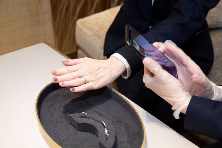 接客は2人体制で。一人のスタッフがリングを着けて、もう一人がそれを映す PHOTO:CHIE FUKAMI