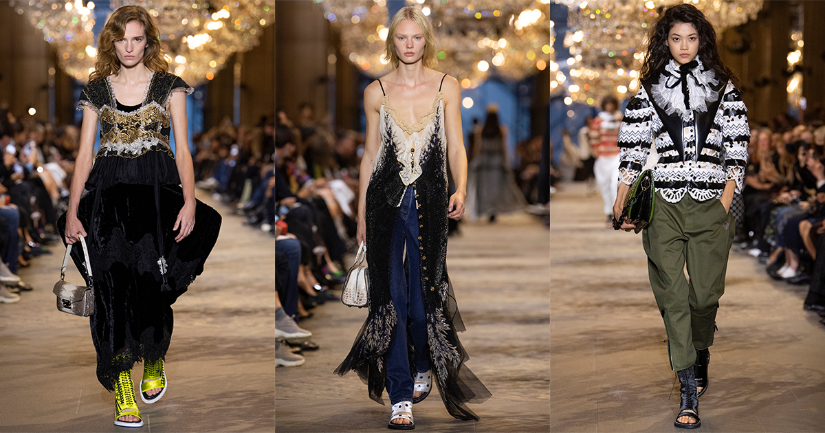 “「時」の仮面舞踏会への招待状”をテーマに、歴史的衣装から現代の装いまでを融合した。横にパニエが広がる18世紀のボールガウンのようなシルエットには、1920年代のイブニングドレスをほうふつとさせる刺しゅうやレースをミックス。クチュール並みにぜいたくな装飾が目を引くスリムなドレスにはジーンズを、19世紀からヒントを得たフリル襟のブラウスにはミリタリー風のジョッパーズパンツを合わせる。さらに、パテントレザーを使ったバッグやスポーティーなブーツサンダルでクラシックな要素との対比を強調。ニコラ・ジェスキエールの豊かな創造力が光る。