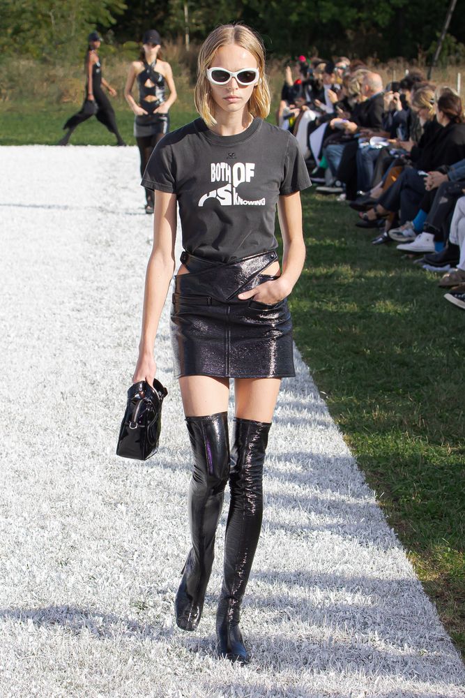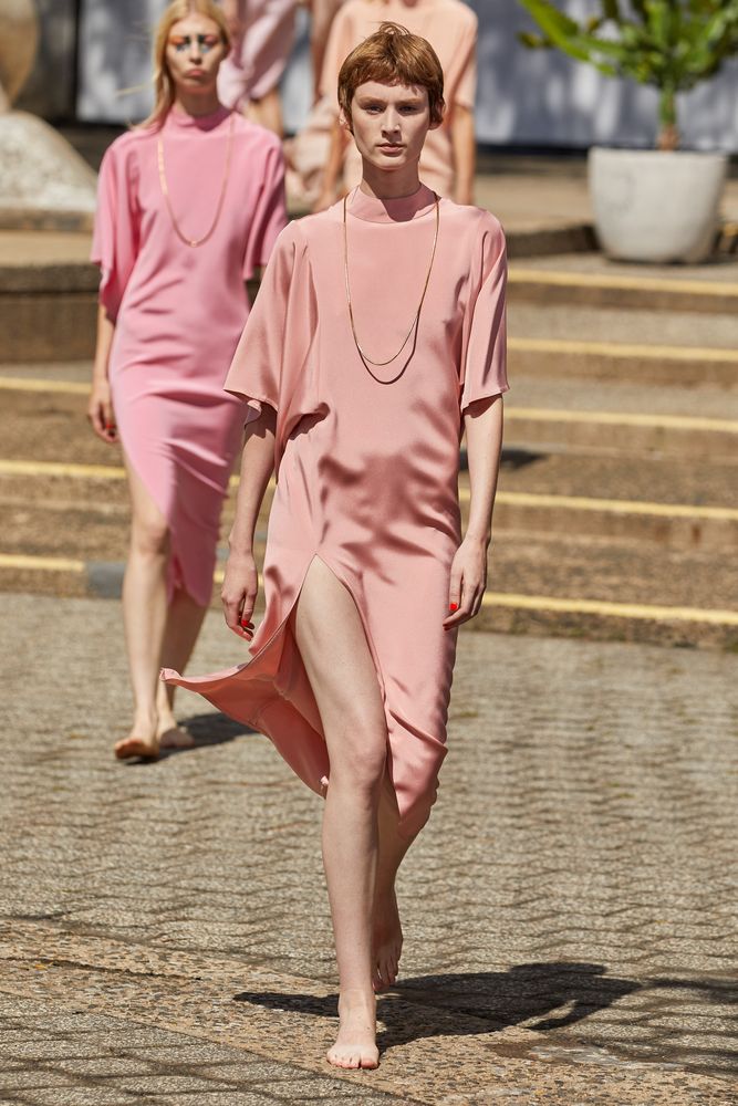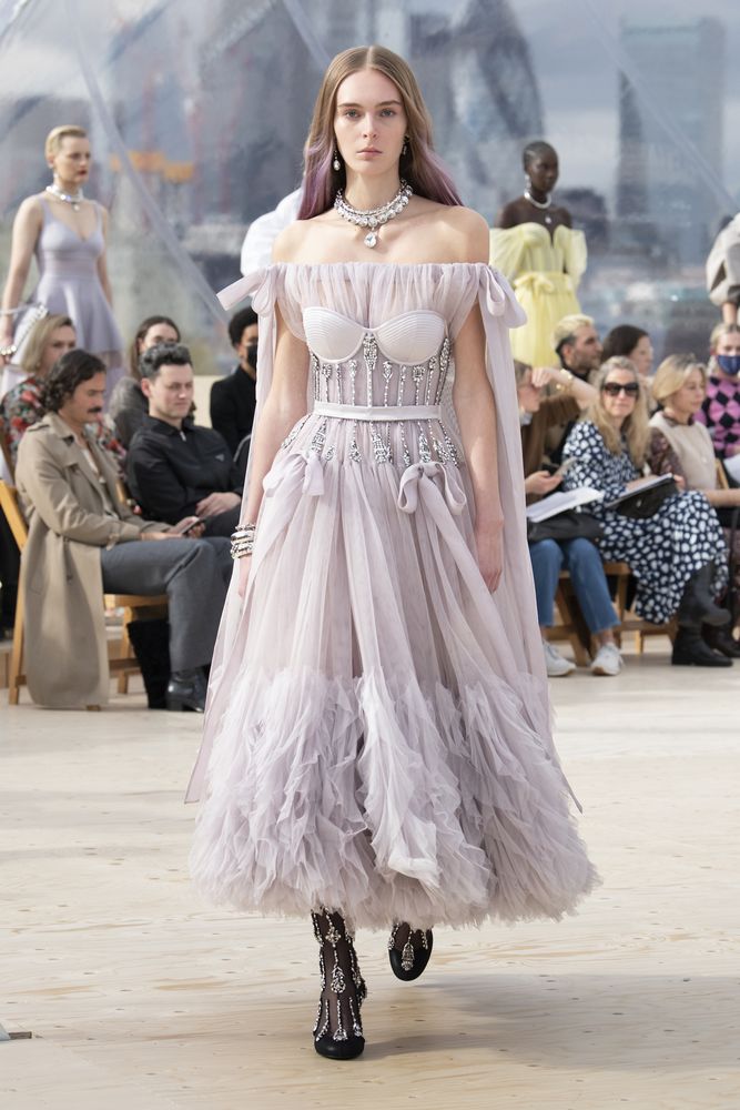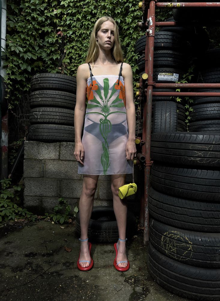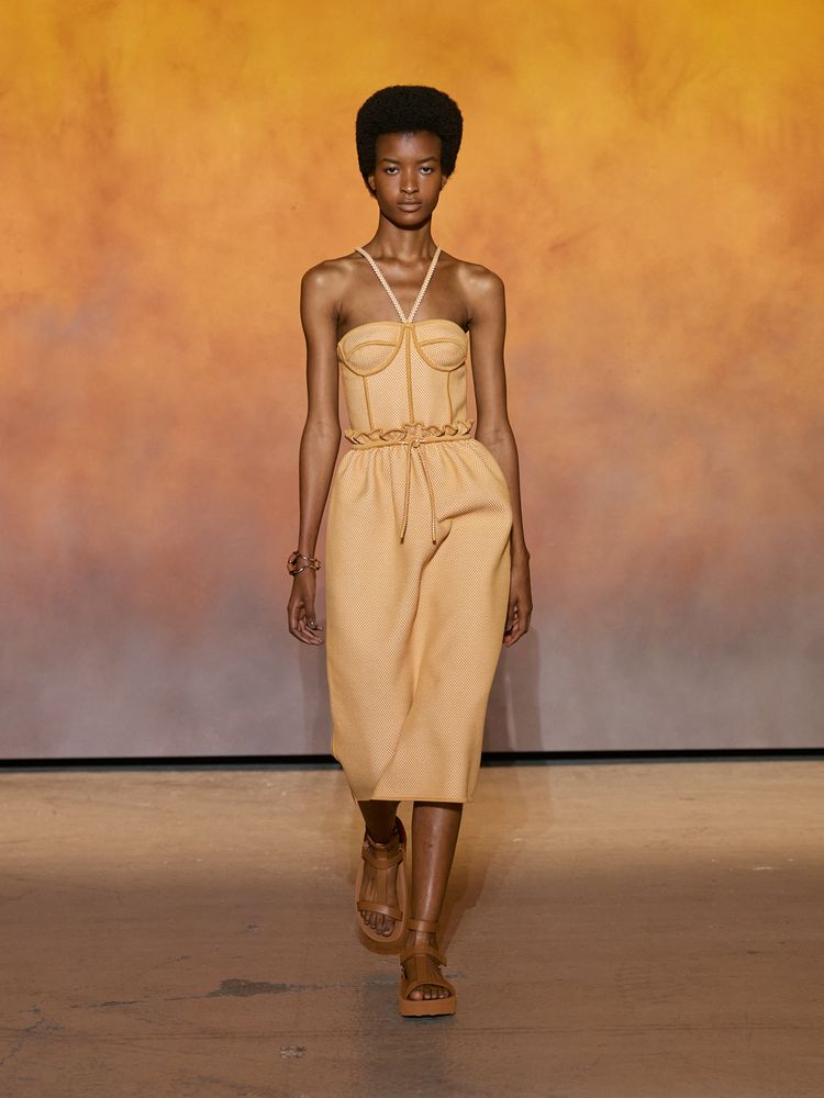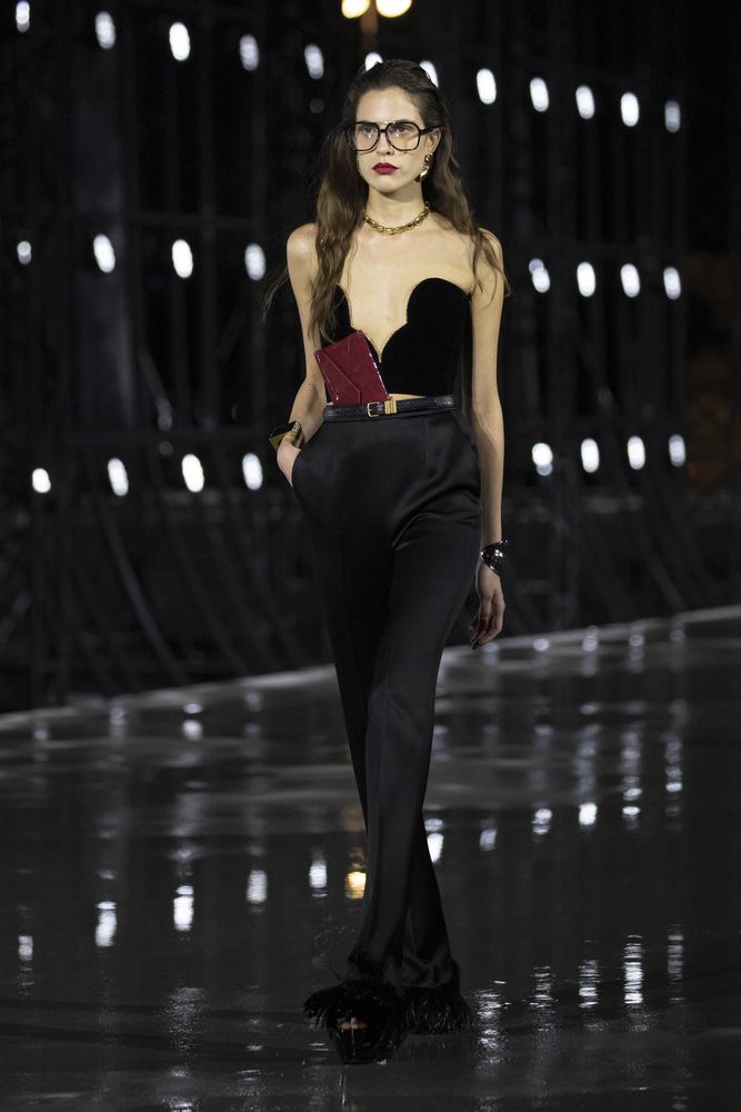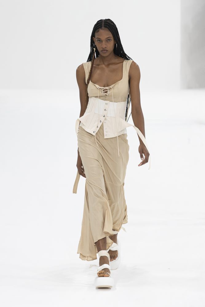 “削ぎ落とすことで生み出す誘惑”をコンセプトに、現代女性のための魅惑的なスタイルを探求した。出発点は、コルセットやトレーンなど、伝統的なイブニングドレスに見られる要素。しかし、その取り入れ方次第でこんなにモダンになるのかと驚かされる。例えば、コルセットのデザインでは、緩めたレースアップのディテールをトップスやカーディガンに用いたり、メタルバーをドレスやシャツにあしらったり。ドレスの背中は大きく開き、ニットはブラカップで胸を強調。トレーンを引くサテンスカートは、大胆なミニ丈で提案する。そこに合わせるのは、1990年代のアーカイブからヒントを得たというボックスシルエットのテーラードジャケットや、ビンテージ感のあるレザーアウター。これらは先に発表されたメンズ・コレクションにも通じるものだが、ウィメンズに取り入れることでコントラストを描き、女性性を際立たせている。