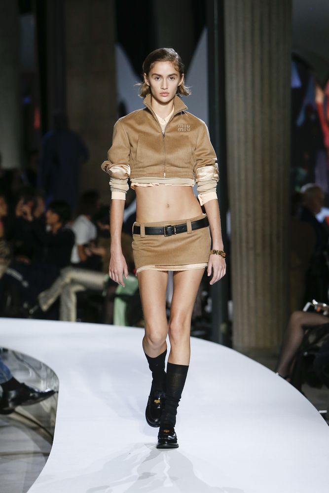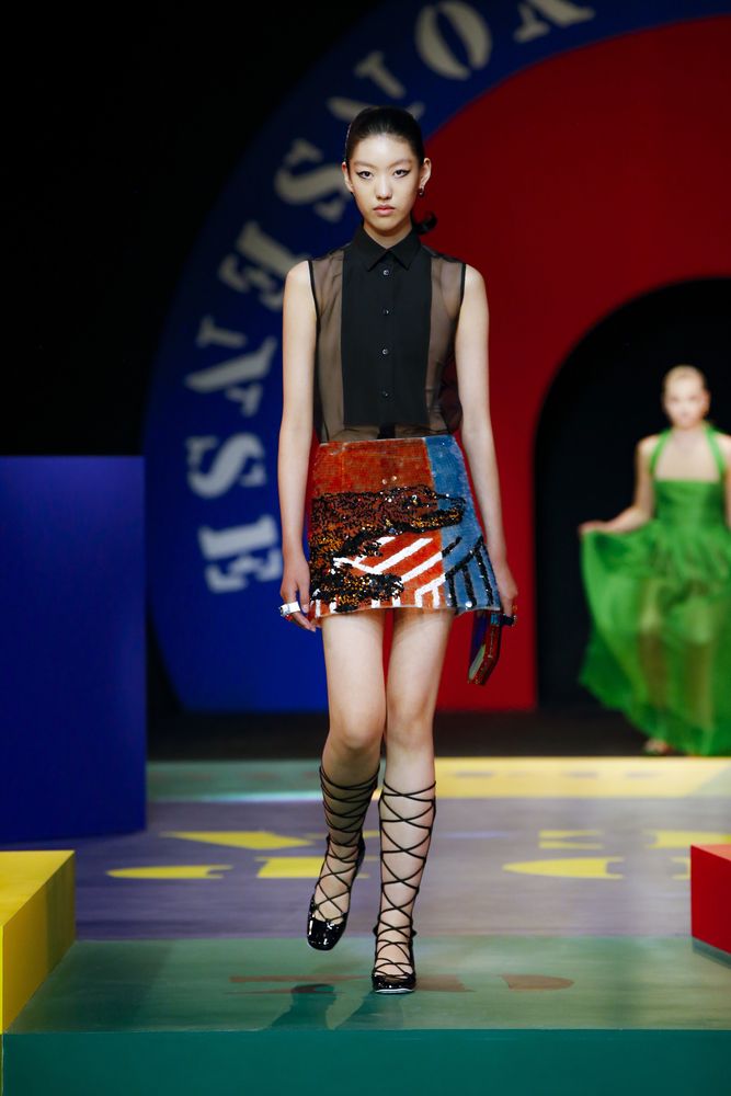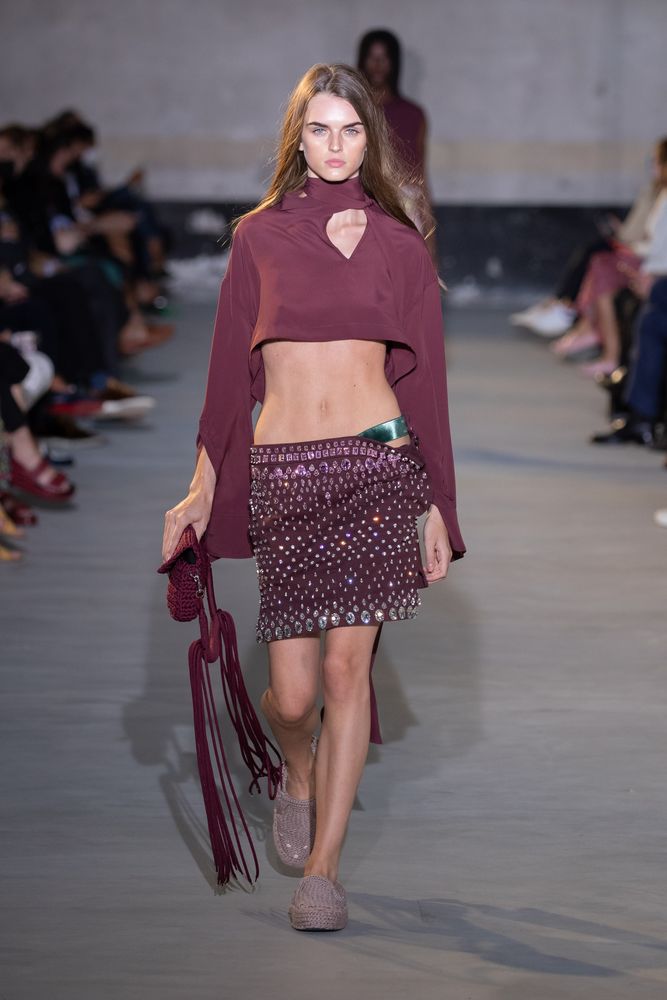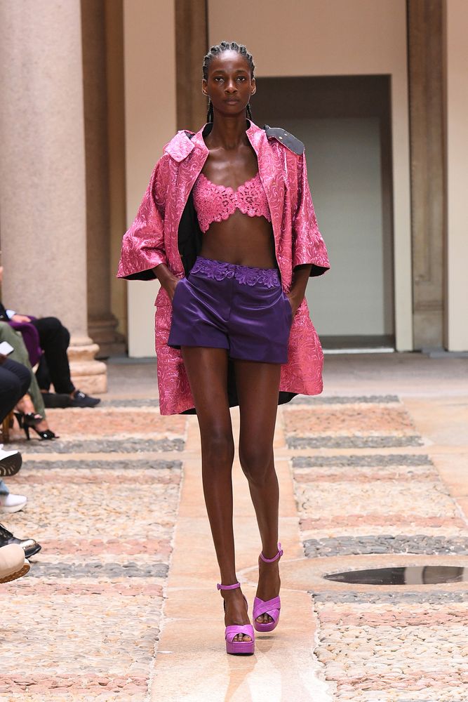 「2000年代」をキーワードの一つに掲げ、ポジティブかつ官能的であることにフォーカス。ブランドらしいアニマル柄やフラワープリント、カラフルなビジューを取り入れながら、Y2Kファッションをグラマラスに表現した。主役は、黒の繊細なレースがあしらわれたランジェリーライクなアイテム。そこに下着がのぞくローウエストのパンツやミニスカートを合わせるスタイルが軸となる。これまでもたびたび若い世代に目を向けたコレクションを見せてきたが、今季は時流にもマッチし、力強さを感じる。