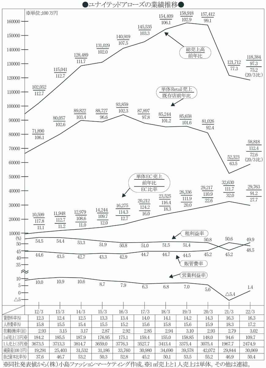 ユナイテッドアローズの22年3月期もコロナ禍で売り上げが激減した前期からさらに2.7%減と回復せず、コロナ前20年3月期の75.2%、会計基準変更前でそろえても77.2%にとどまる。粗利益率は値引きの抑制で49.9%と前期から4.7ポイント回復したが前々期の50.8%には届かず、棚資産回転は0.51回も劣化した。販管費率も48.5%と同2.1ポイント抑制されたが、前々期の45.2%からは3.3ポイントも高い。営業利益は前期の66億1300万円の赤字から16億8300万円の黒字に浮上したが、営業利益率は1.4%と前々期の5.6%には遠く、回復というより落ち止まったに過ぎない。