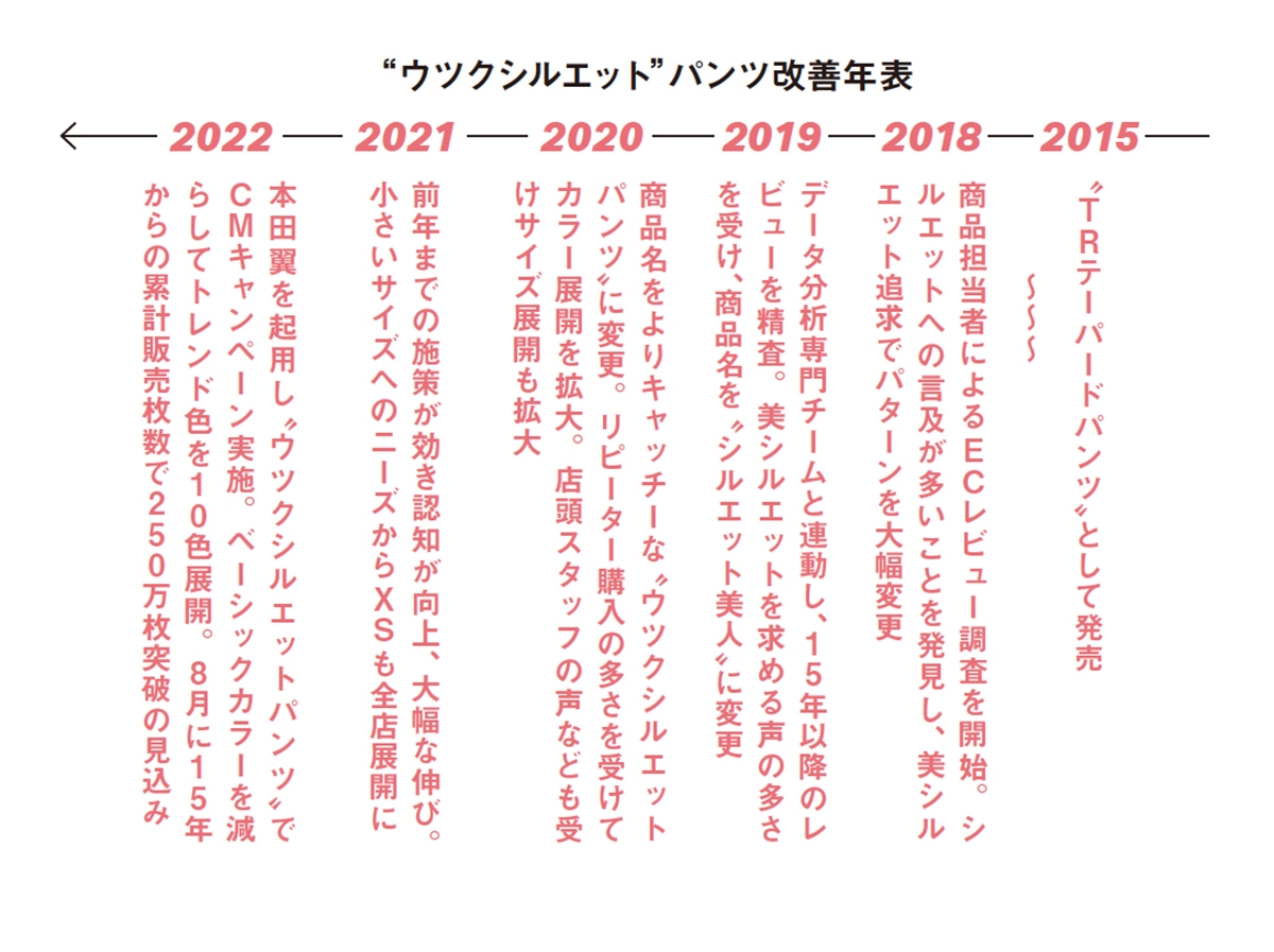 いい商品を作っても、その価値が客に伝わらなければ意味がない。その点でも“ウツクシルエットパンツ”はさまざまな試行錯誤を重ねてきた。一番大きな改善点は商品名。“ウツクシルエットパンツ”の発売当初の名称は“TRテーパードパンツ”。TRはポリエステル・レーヨン素材を指すファッション業界用語で、業界人ならこの名前からなんとなく商品をイメージできるが、一般消費者には全く響かない。太田本部長が事業部に参画した18年以降、こうした売り手視点だった商品名を順次切り替え、商品ごとに最も伝えたい価値を名称に反映するようにした。その結果、“TRテーパードパンツ”は19年に“シルエット美人”に変更。さらなるキャッチーさを求め、20年に“ウツクシルエットパンツ”に行き着いた。