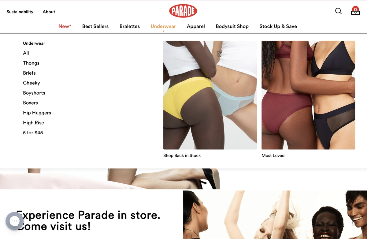 ファストファッション系が勢ぞろいのブロードウェイ沿いにも、スタートアップ系の下着ブランド「パレード(PARADE)」が昨年末にオープンした。20年にスタートしたばかりのブランドで、下着のデザインもカラフルで知られているが、ショップの中もインスタ映えするポップな色使い。インクルーシブとサステナビリティを掲げ、キャッチーなビジュアルでZ世代の気持ちをつかんでいる。創設者も20代前半の女性。商品の80〜95%はリサイクル素材を使用しており、23年までに100%を目指している。
