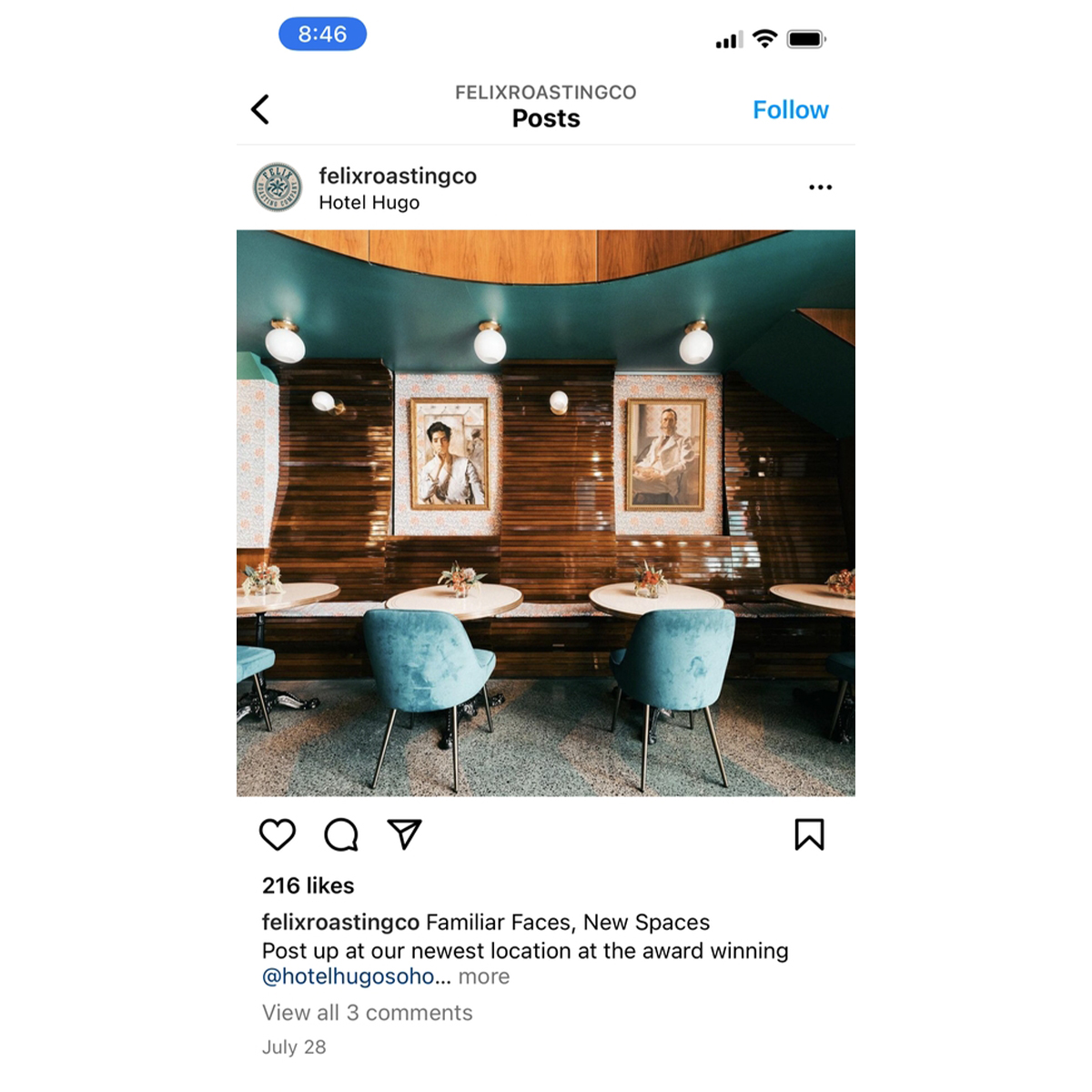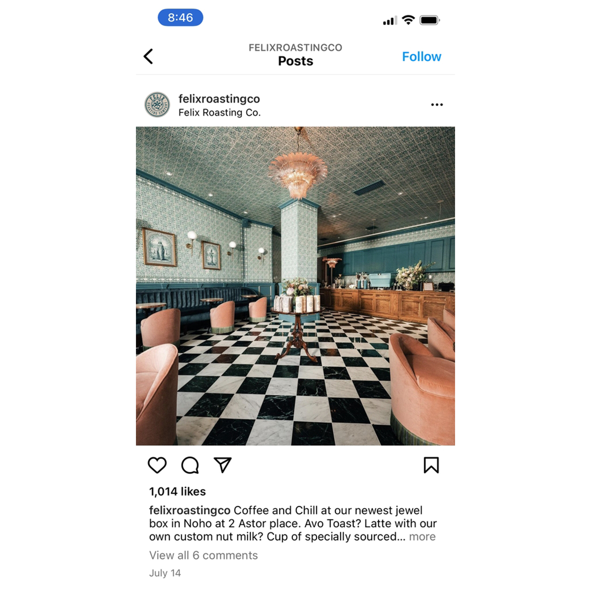 飲食では最近、「フェリックス・ロースティング・カンパニー(FELIX ROASTING CO.)」(写真は同ブランドの公式インスタグラムから)が次々とオープンしている。珍しくエレガントなコーヒーチェーンは現在、マンハッタンに4店舗を展開している。