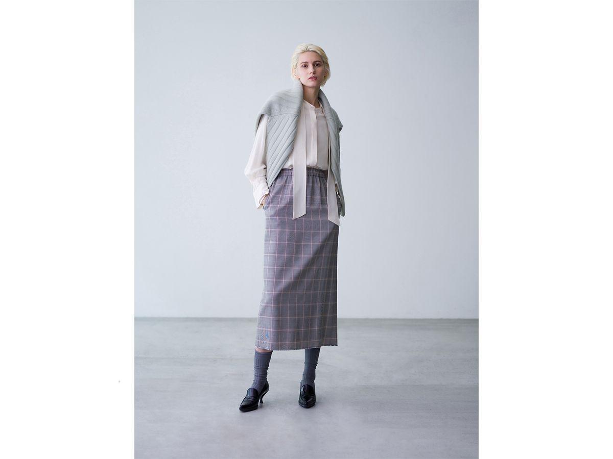 ウエストマークのワンピースライクなシルエットで、晩夏のレイヤードアイテムとしても活躍する1着。襟付きのジレとは違う柔らかい雰囲気。細番手ウールのリバー仕立てで、薄手ながらにも程よいハリ感と柔らかさがある。7月中旬に受注会を開催し、8月中旬から店頭販売したところ早い時期から秋物を意識し始めた客から好評だった。