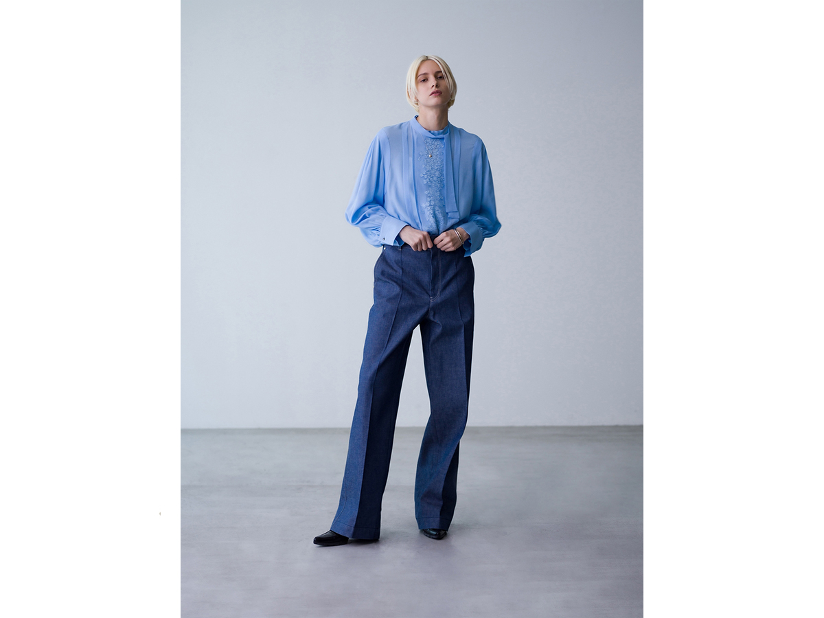 センタープレス入りのワイドストレートで、前ポケットの白金リベットや後ろの玉縁ポケットのディテールでカジュアルになり過ぎないブランドらしいジーンズに仕上げた。インスタライブでの反響が大きく、スタッフ着用率が高かったことも販促効果につながった。同素材のデニムジャケットやスカートも、全ての形で完売目前。