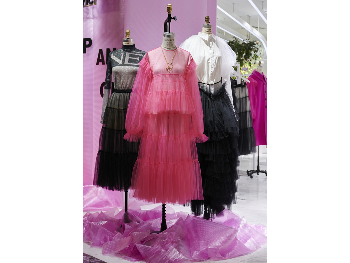 秋の立ち上がりで推しているチュールやピンクといった要素が狙い通り好調。チュールアイテムは「モリー ゴダード」「チカ キサダ」のほか、中国出身で日本在住のデザイナーが手掛ける「ヴィヴィアーノ」などを集積している。写真のマネキン中央のピンクのチュールブラウス(3万800円)、スカート(4万1800円)はともに「ヴィヴィアーノ」。