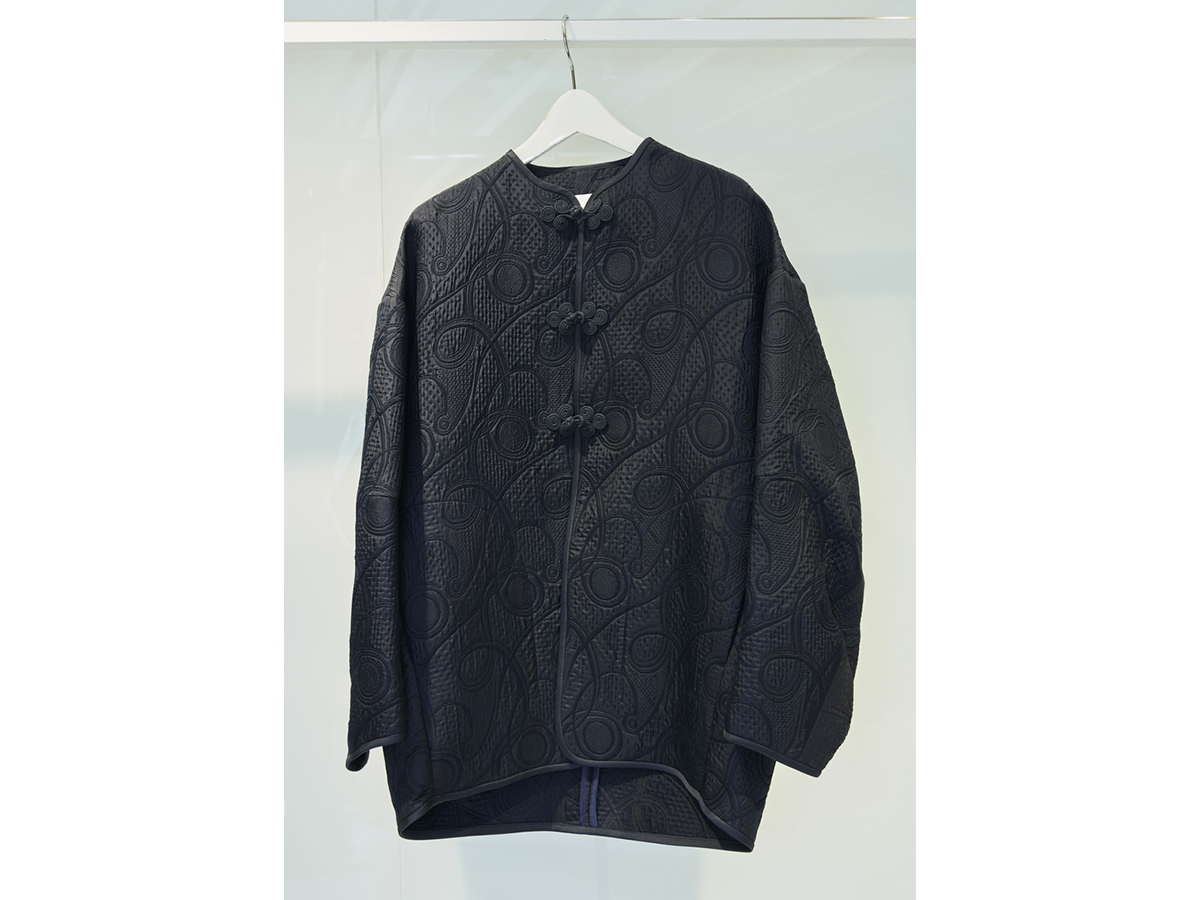 リ・スタイルの売り上げの軸になっているという「マメ クロゴウチ」が、今秋の立ち上がりも売れている。特に人気なのは三重織ジャカード生地を使ったチャイナジャケット(9万3500円)とフェアアイル柄のニット(7万5900円)。チャイナジャケットはベージュとカーキが既に完売したが、9月28日からの「マメ」のプロモーションイベントに合わせた限定商品として、写真のネイビーを仕込んでいる。ほか、袖がプリーツになった白いブラウスなども完売した。