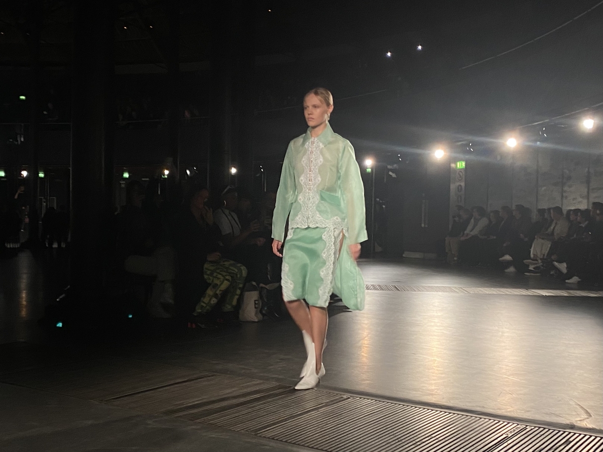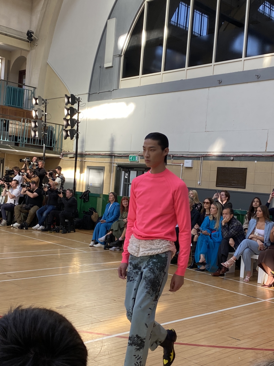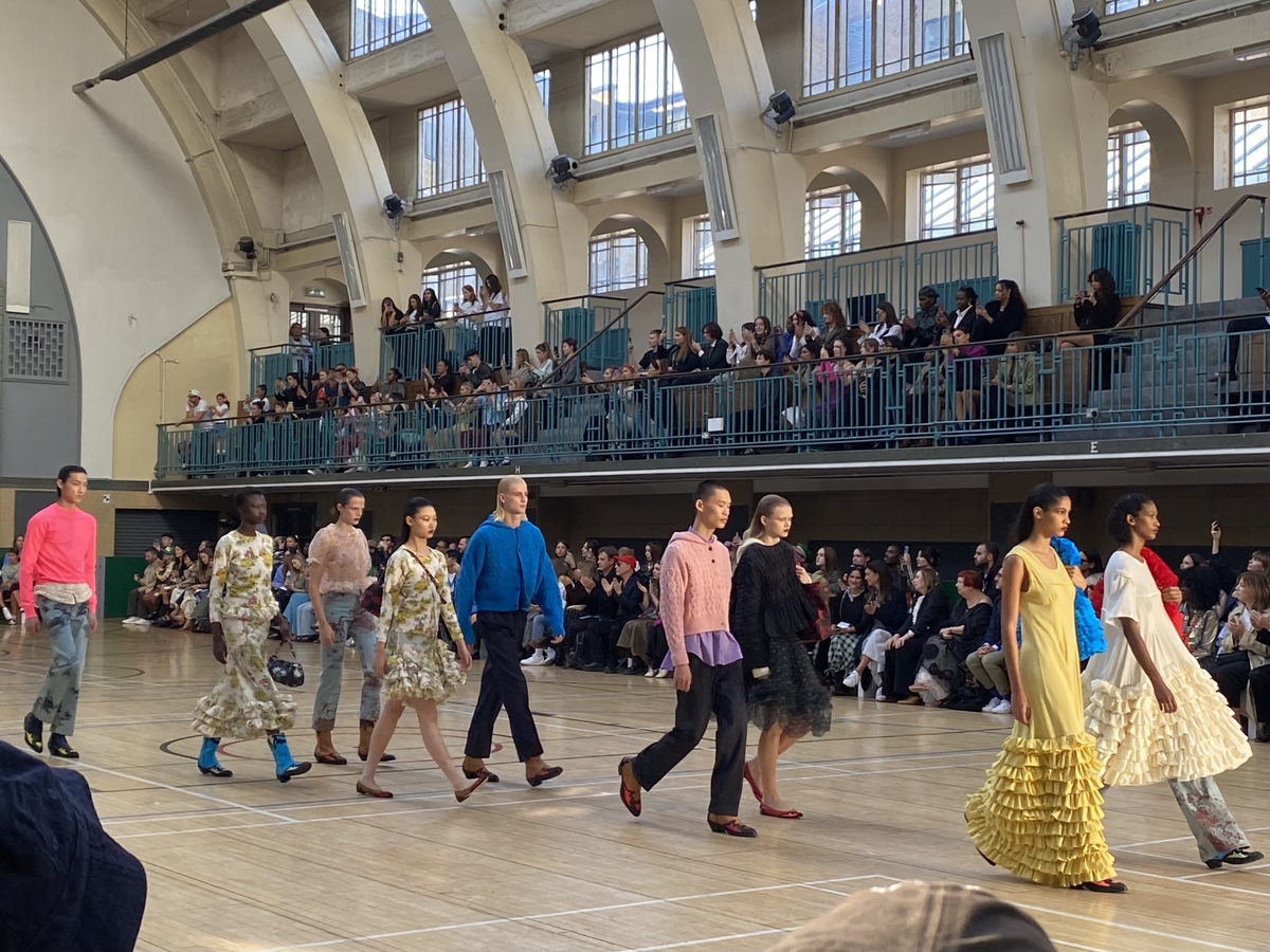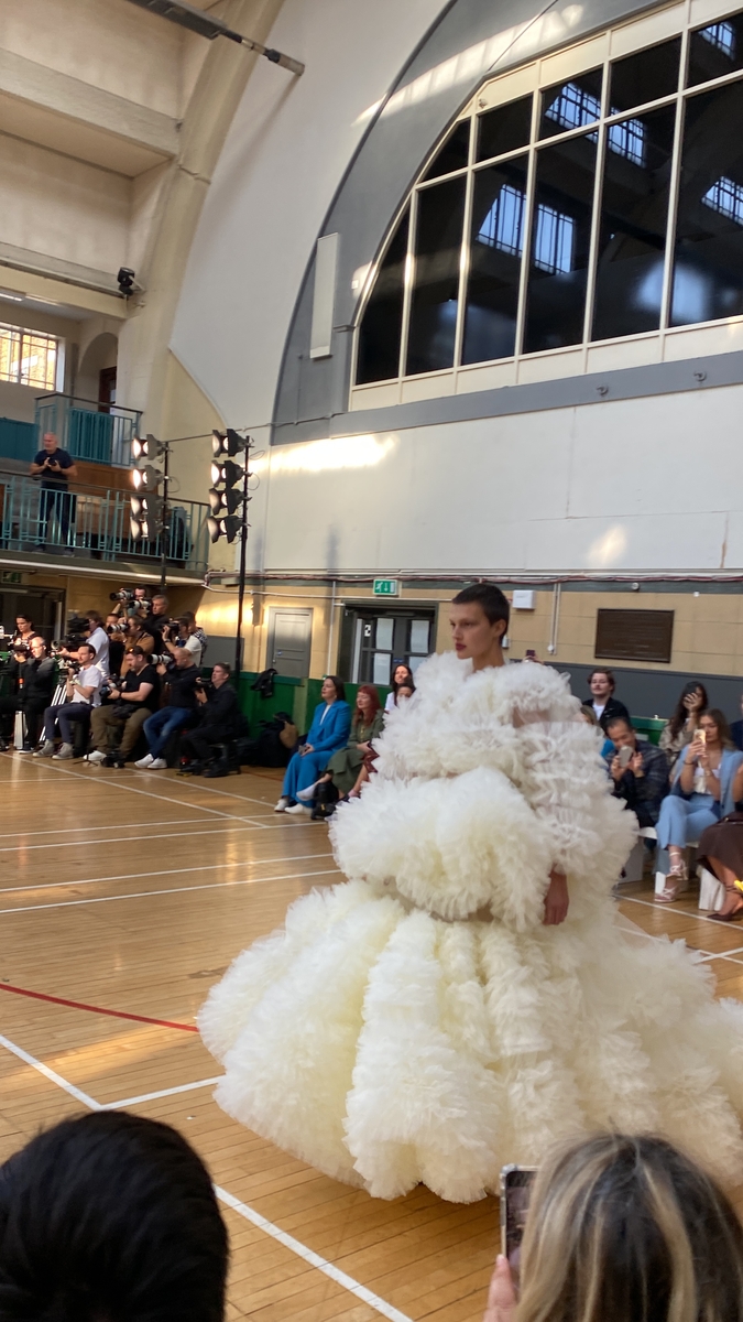 「モリー ゴダード(MOLLY GODDARD)」はレジャーセンターを会場に選んだ。今季は、インターネットが生まれる前の時代のレッドカーペットの装いからインスピレーションを得たという。ショーは4つのパートに分かれており、プレーンからプリント、そして2つの衝突で活力が増していく演出。20世紀に活躍したファッションデザイナー、チャーリー・ジェームズ (Charles James)に触発されて、前半はゴダードの代名詞であるチュールではなく、コットンを使ったフリルやドレープで有機的なシルエットを生み出すドレスがランウエイを飾った。ニットウエアとデニムには、過去に制作したトゥウィンキー(Twinky)プリントを復活させ、ギャザーのトップスや半透明のチュールを重ねてカジュアルに提案。メンズウエアもテーラリングと縁取りがフリルになったトップスの連続で、リアルクローズを展開した。最後は蛍光カラーの色のドッギングと、ニット、ジャージー、ダイナミックなチュールでコントラストの効いたルックで帰着。多くの要素を盛り込みすぎたのか、特に中盤はアーカイブの寄せ集めのように感じられて、今季のメッセージを明確に提示できていなかったように思う。