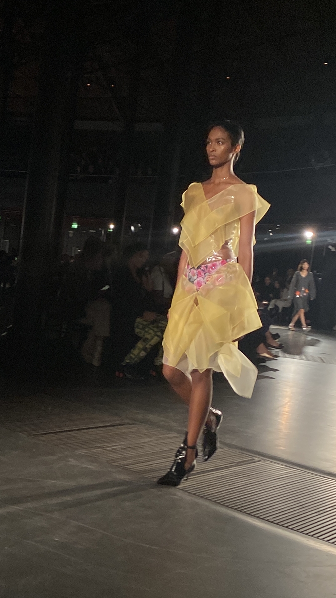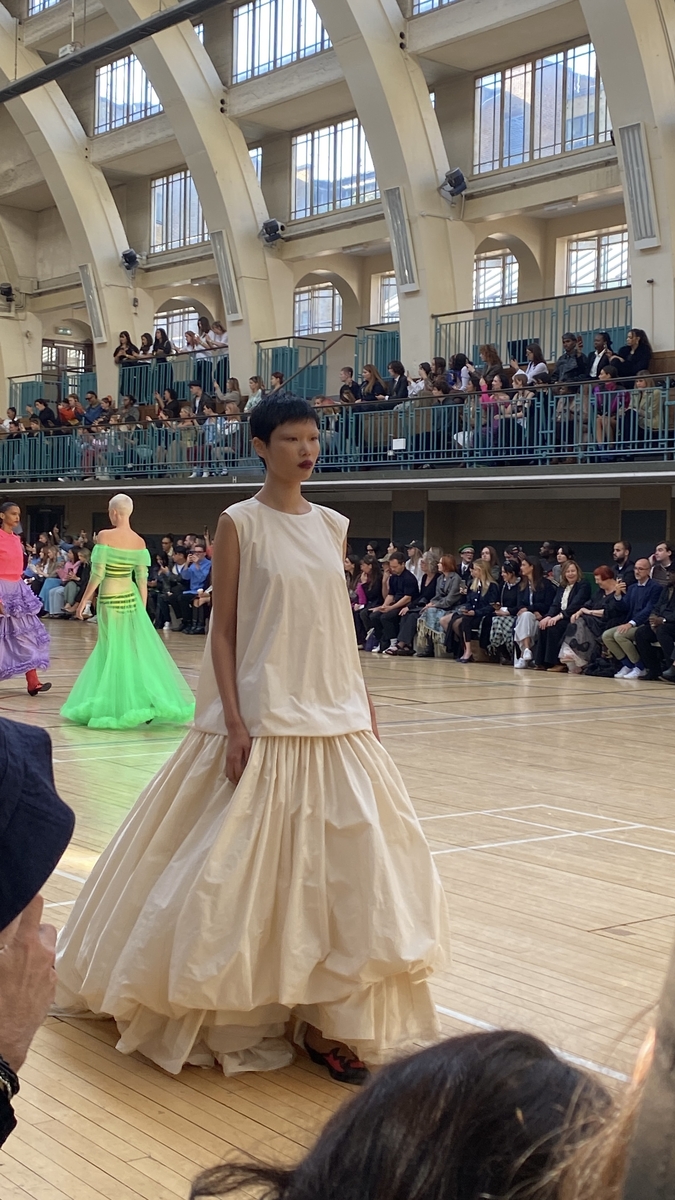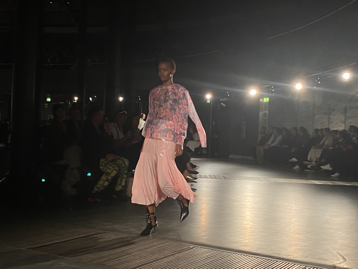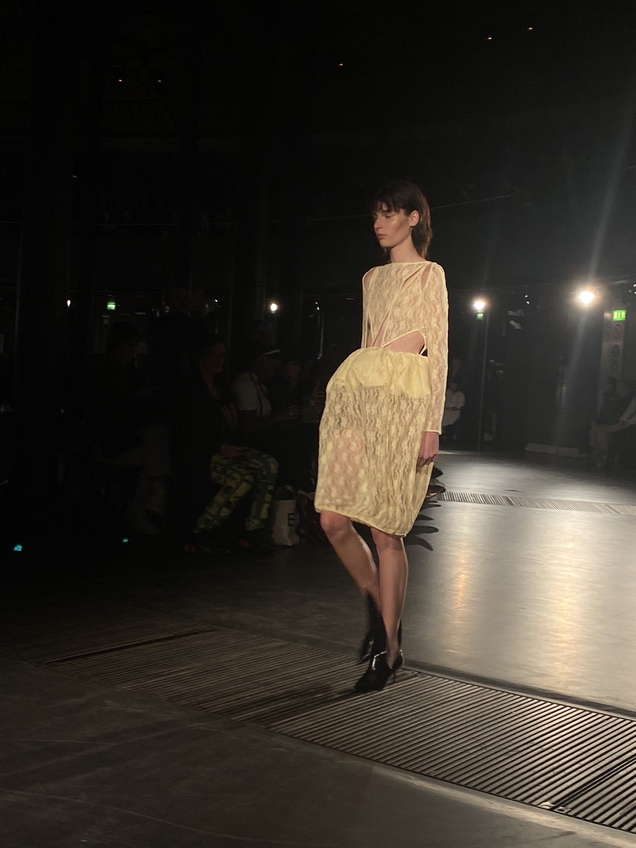 「モリー ゴダード(MOLLY GODDARD)」はレジャーセンターを会場に選んだ。今季は、インターネットが生まれる前の時代のレッドカーペットの装いからインスピレーションを得たという。ショーは4つのパートに分かれており、プレーンからプリント、そして2つの衝突で活力が増していく演出。20世紀に活躍したファッションデザイナー、チャーリー・ジェームズ (Charles James)に触発されて、前半はゴダードの代名詞であるチュールではなく、コットンを使ったフリルやドレープで有機的なシルエットを生み出すドレスがランウエイを飾った。ニットウエアとデニムには、過去に制作したトゥウィンキー(Twinky)プリントを復活させ、ギャザーのトップスや半透明のチュールを重ねてカジュアルに提案。メンズウエアもテーラリングと縁取りがフリルになったトップスの連続で、リアルクローズを展開した。最後は蛍光カラーの色のドッギングと、ニット、ジャージー、ダイナミックなチュールでコントラストの効いたルックで帰着。多くの要素を盛り込みすぎたのか、特に中盤はアーカイブの寄せ集めのように感じられて、今季のメッセージを明確に提示できていなかったように思う。