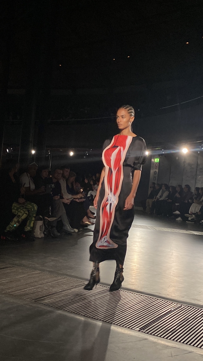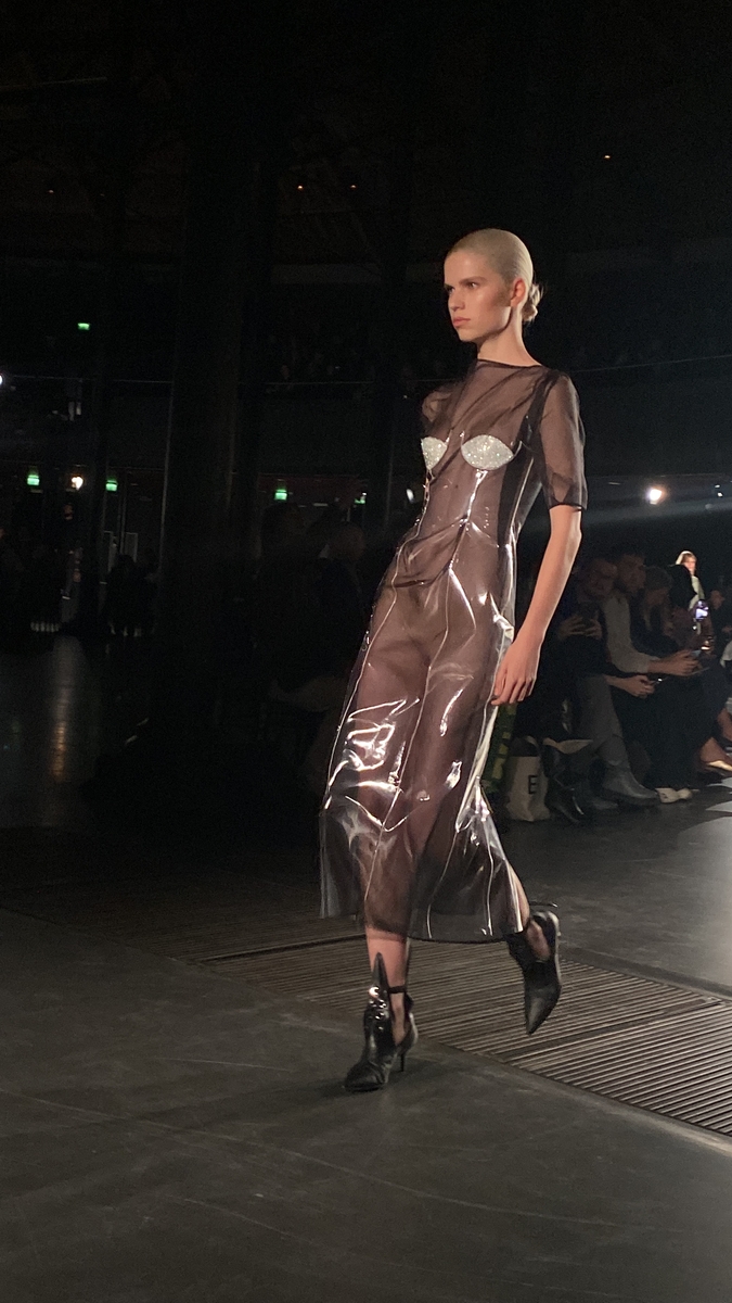 2年ぶりにショーを開催した「クリストファー ケイン(CHRISTOPHER KANE)」。カムデンタウンに位置するライブ会場のサークル状のランウエイで、人体の美しさと複雑さを称えるコレクションを披露した。洋服や素肌の上でクリアのストラップを縛り、人体の内部構造を露わにする解剖学的な表現が今季のコンセプト。ドレスやランジェリーを解体してクリアのベルトで繋ぎ、想定外の露出で艶めかしさを醸し出し、レースで縁取られたパステルカラーのランジェリードレスも甘い蜜で誘惑する危険な香りが漂った。ランジェリーやボディコンシャスなアイテムで、いかに体を美しく見せるかという昨今のウイメンズの主要なテーマを、ケインらしく独自の風変わりな視点で表現した。彼なりのセクシュアリティの概念に面白みはあったが、ファッション性としての新鮮さには欠けていたようだ。