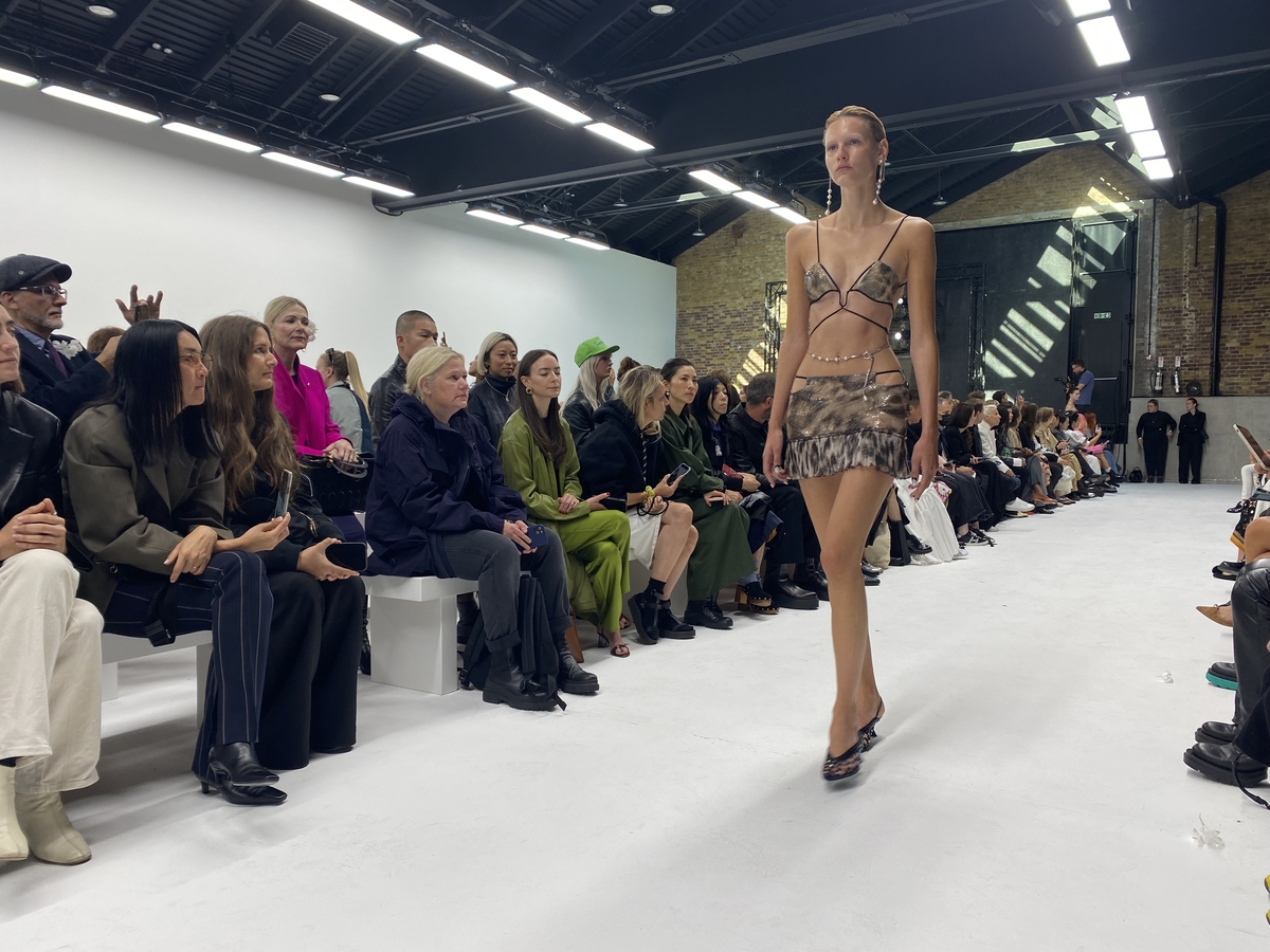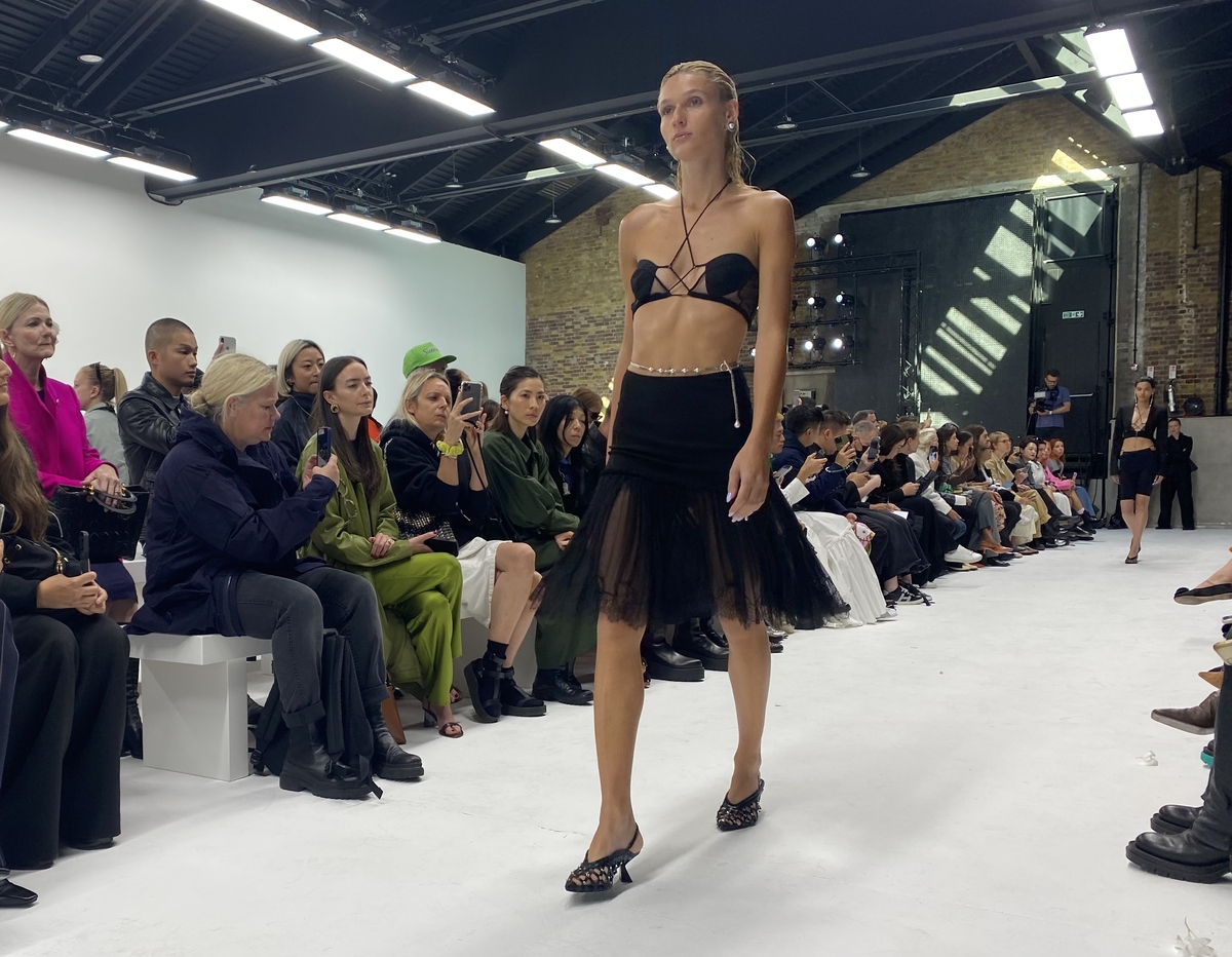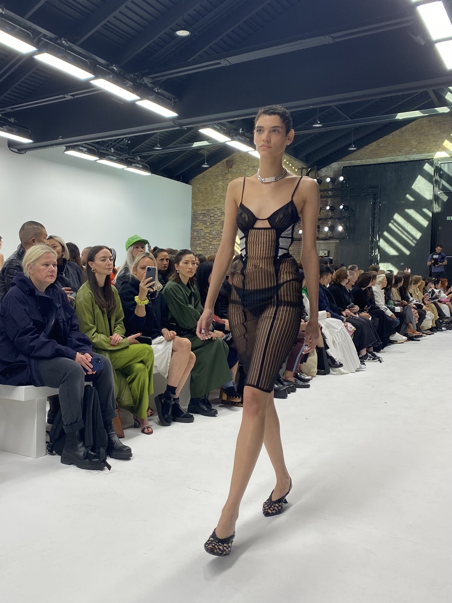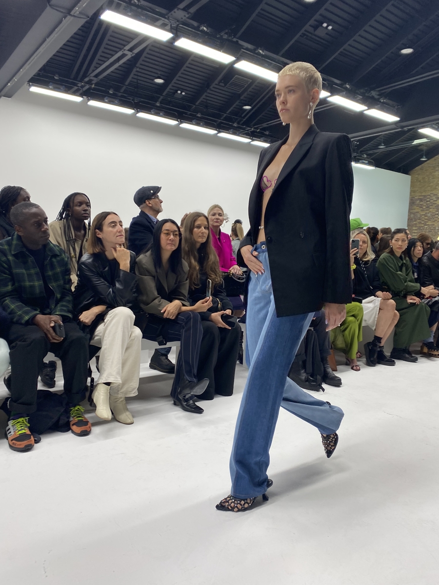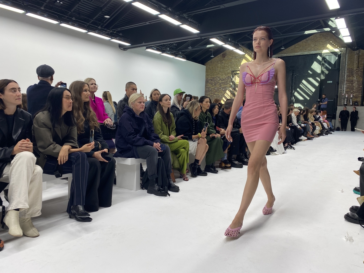 2021年LVMHプライズを受賞した「ネンシ ドジャカ(NENSI DOJAKA)」は、LFW新人支援プロジェクト「ニュージェン(New Gen)」のプログラムから離れて初となるショーを開催。真っ白で無機質なショー会場で、ランジェリーのワイヤーや繊細なストラップ、可憐なレースとハートのモチーフが際立っていた。ブランドの基盤となるランジェリーの構造は、90年代のボディコンシャスなドレスと融合され、カクテルからイブニングドレスにまでバリエーションを広げた。「今季はルレックスやスパンコール、濡れたような質感の装飾に挑戦したかった」と語る通り、ナイトアウト向けの装飾主義なドレスがランウエイで光を放った。レッドカーペットで若い世代のセレブリティが着用することを想定してか、終盤はブラトップを備えたロングドレスが登場。一方で、「日常着として着用するアイデア」を示したのが、サイクリングショーツや初の制作となるジーンズだ。取って付けた仮初めのように浮いていたが、現実的な提案としては理にかなっている。卸売りのアカウントを爆発的に増やし、カジュアルからイブニングにまで手広く展開する手法は、長期的な視点で見ると懸念も多い。露出度の高い洋服なだけに秋冬シーズンが弱点とあって、移り気なZ世代の注目を引き続けるためにも、次シーズンが重要になりそうだ。