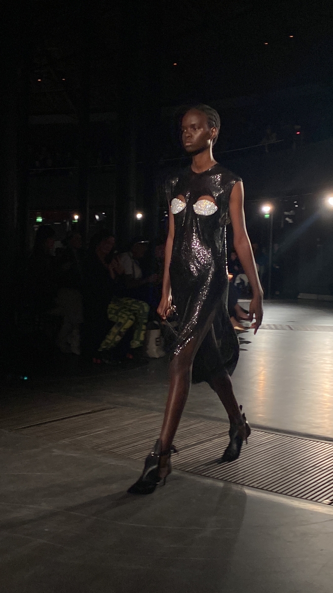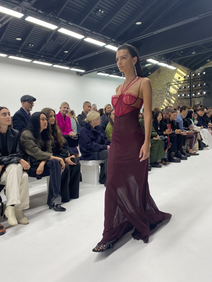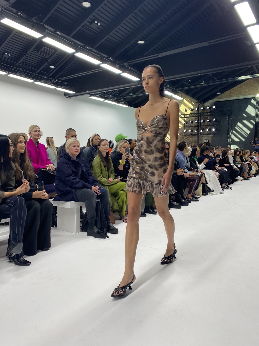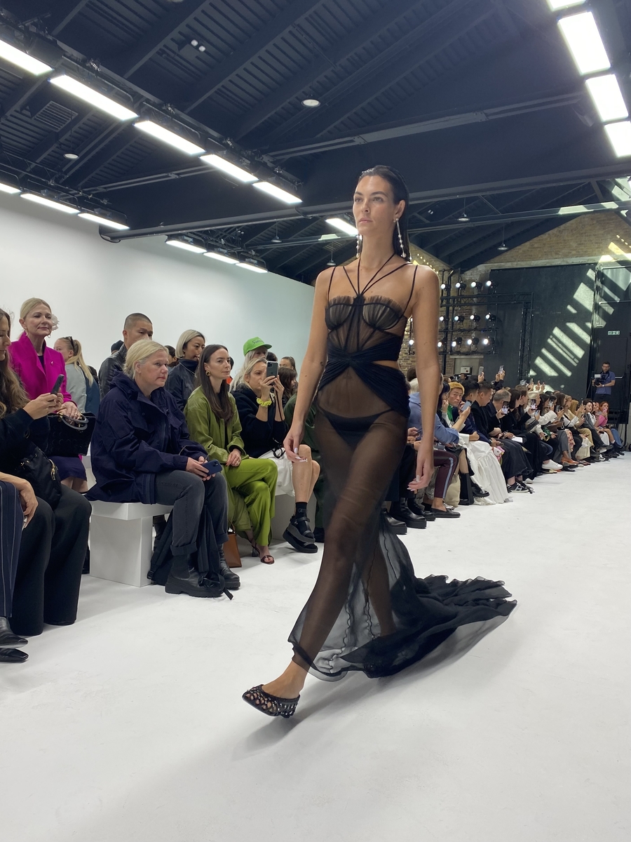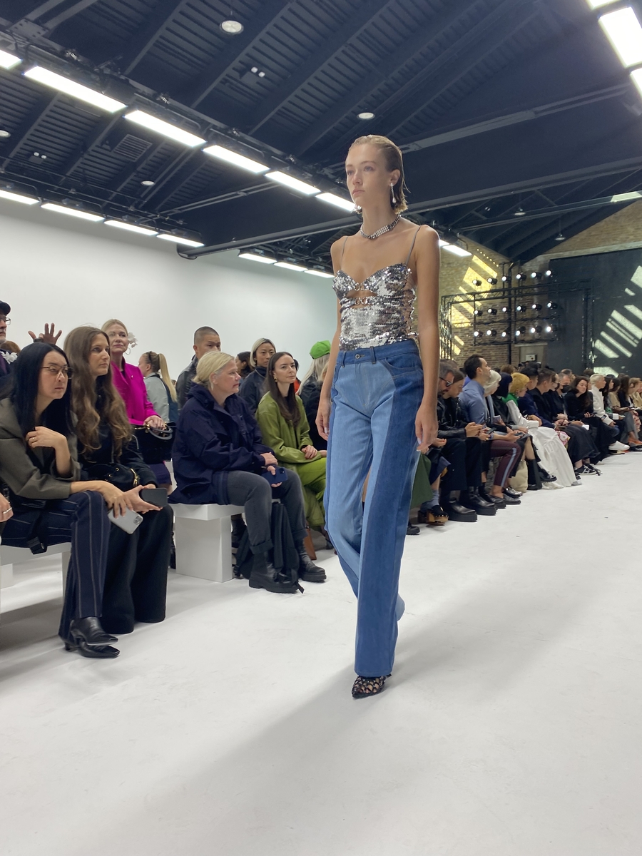 2021年LVMHプライズを受賞した「ネンシ ドジャカ(NENSI DOJAKA)」は、LFW新人支援プロジェクト「ニュージェン(New Gen)」のプログラムから離れて初となるショーを開催。真っ白で無機質なショー会場で、ランジェリーのワイヤーや繊細なストラップ、可憐なレースとハートのモチーフが際立っていた。ブランドの基盤となるランジェリーの構造は、90年代のボディコンシャスなドレスと融合され、カクテルからイブニングドレスにまでバリエーションを広げた。「今季はルレックスやスパンコール、濡れたような質感の装飾に挑戦したかった」と語る通り、ナイトアウト向けの装飾主義なドレスがランウエイで光を放った。レッドカーペットで若い世代のセレブリティが着用することを想定してか、終盤はブラトップを備えたロングドレスが登場。一方で、「日常着として着用するアイデア」を示したのが、サイクリングショーツや初の制作となるジーンズだ。取って付けた仮初めのように浮いていたが、現実的な提案としては理にかなっている。卸売りのアカウントを爆発的に増やし、カジュアルからイブニングにまで手広く展開する手法は、長期的な視点で見ると懸念も多い。露出度の高い洋服なだけに秋冬シーズンが弱点とあって、移り気なZ世代の注目を引き続けるためにも、次シーズンが重要になりそうだ。
