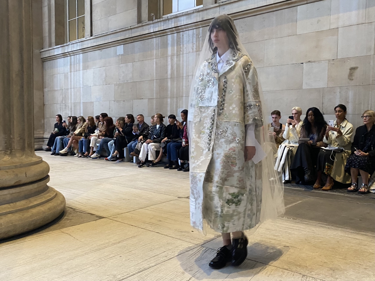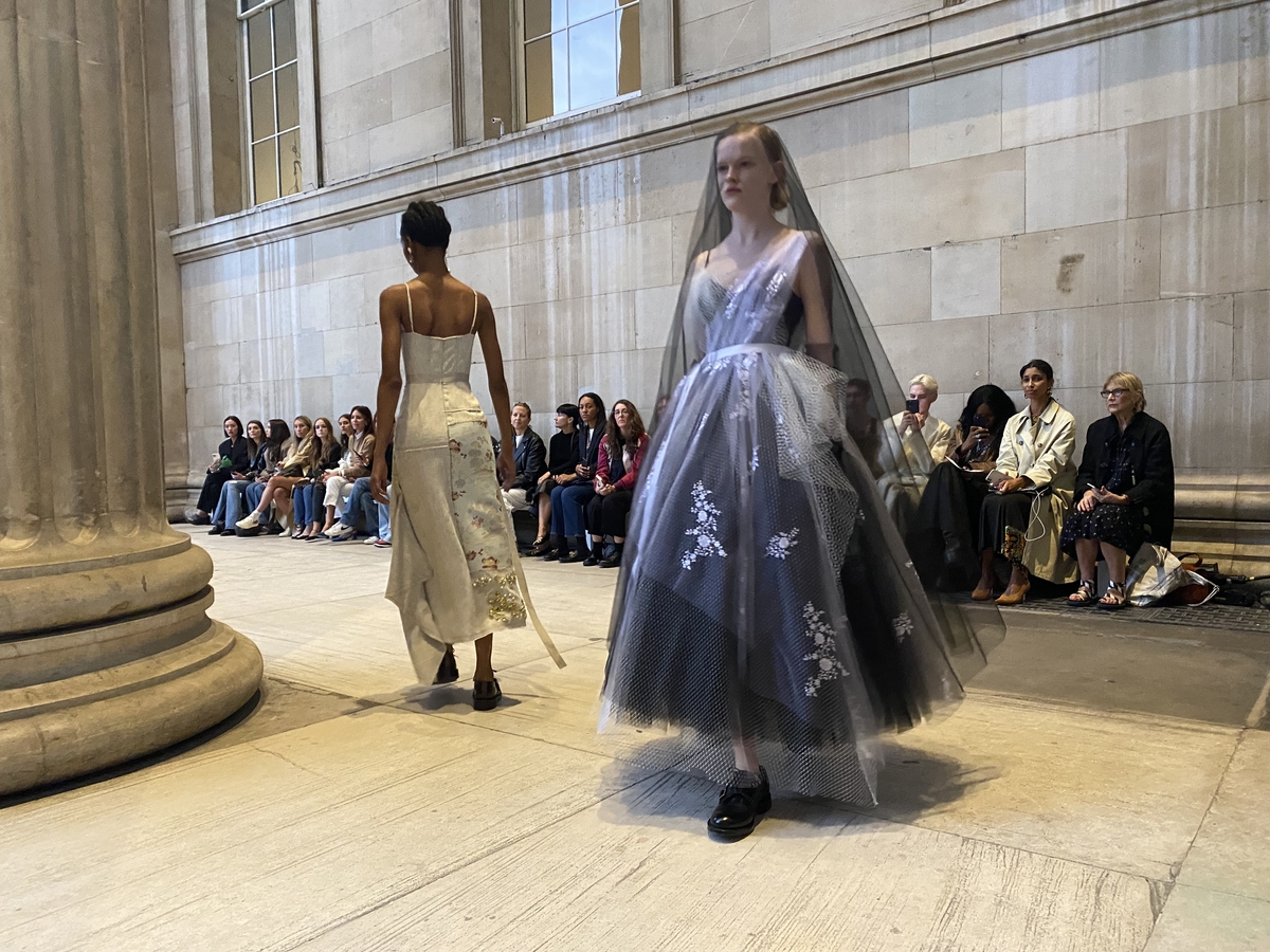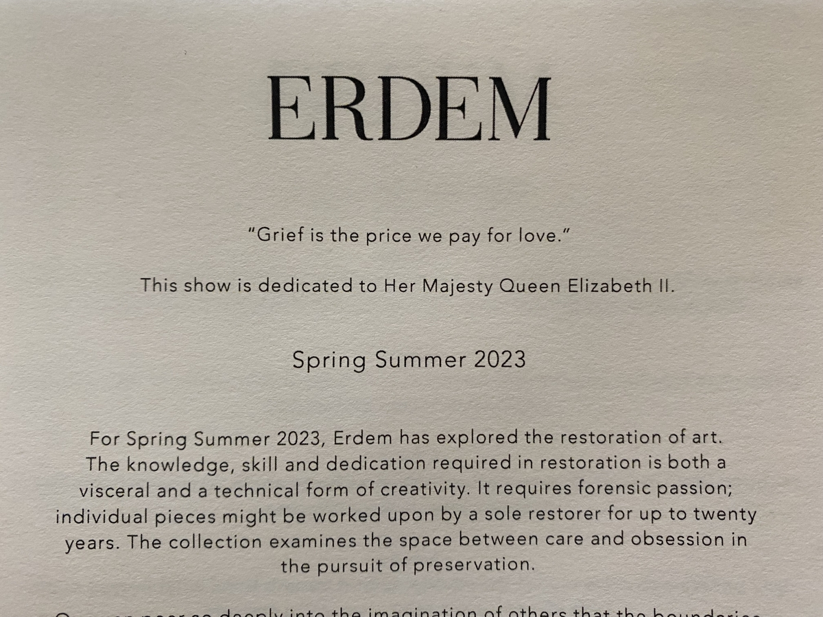 歴史を探求した「アーデム(ERDEM)」は、過去への賛美と芸術への情熱に溢れた夢のようなショーを大英博物館の回廊で行った。デザイナー、アーデム・モラリオグル(Erdem Moralioglu)はロンドンの主要な美術館である大英博物館(British Museum)、テート美術館(Tate)、ヴィクトリア&アルバート博物館(Victoria and Albert Museum)、ナショナル・ギャラリー(National Gallery)の美術修復家の作業に感銘を受けたという。「18世紀の刺しゅうドレスを修復させるための複雑なチュールの内部構造と、15世紀に描かれた油絵が蘇る最先端技術を目の当たりにした」とモラリオグルは回想した。ニュールックに言及したAラインのドレスをチュールでロマンチックに昇華させ、絵画はモノクロでコットンドレスに描いた。美術作品を保護するためのダストカバーから得たアイデアによるチュールのベールが幻想的で、贅沢な生地を使ったドレスを気高い作品へと引き立てた。
