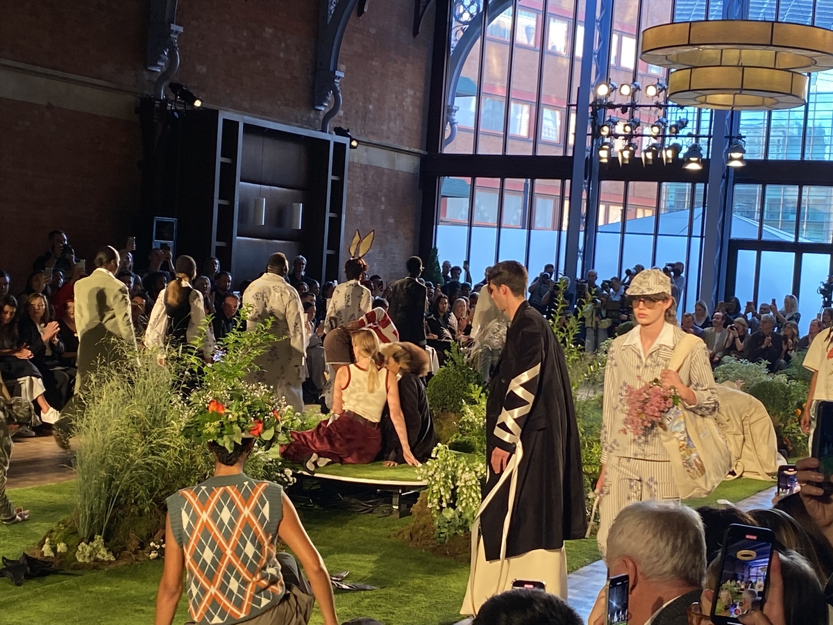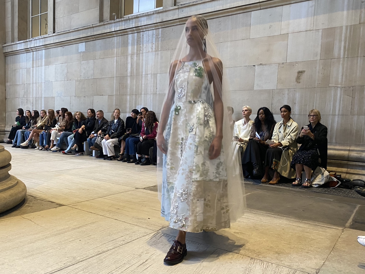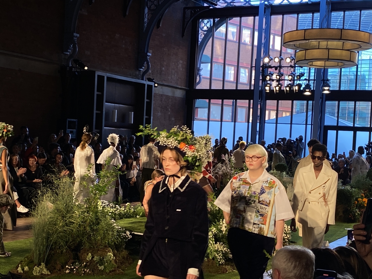 今季は、セントパンクラス・ルネッサンス・ホテル(St. Pancras Renaissance Hotel)の中に本物の草花で庭園を作って会場セットにした。着想源は、イギリスの社交界の名士で作家のヴィタ・サックヴィル=ウェスト(Vita Sackville-West)とヴァイオレット・トレフューシス(Violet Trefusis)の装いと生き様だという。彼女らはともに男性と結婚しながらもクィアのカップルだった。二人が交わした手紙が、モデルとしてランウエイを歩いた役者によって演技を交えて読み上げられた。コーデュロイのタキシード、花柄プリントのトレンチコート、リボンの装飾を施した黒のモーニングコートなど伝統的なイギリスのユニフォームに付随する、時代と性別と階級の枠組みを軽やかに崩壊させた。アイリッシュリネンとシルクをパッチワークしたシャツや滑らかなリネンのセットアップは、工場で調達した余剰生地とデッドストックで構成したアップサイクル。生地のバリエーションに加え、ヘッドピースとバッグのアクセサリーも物語の脇役として活躍し、表現力に磨きがかかっていた。クリエーションとしてまだまだ余白がありそうで、今後が期待できる注目株だ。