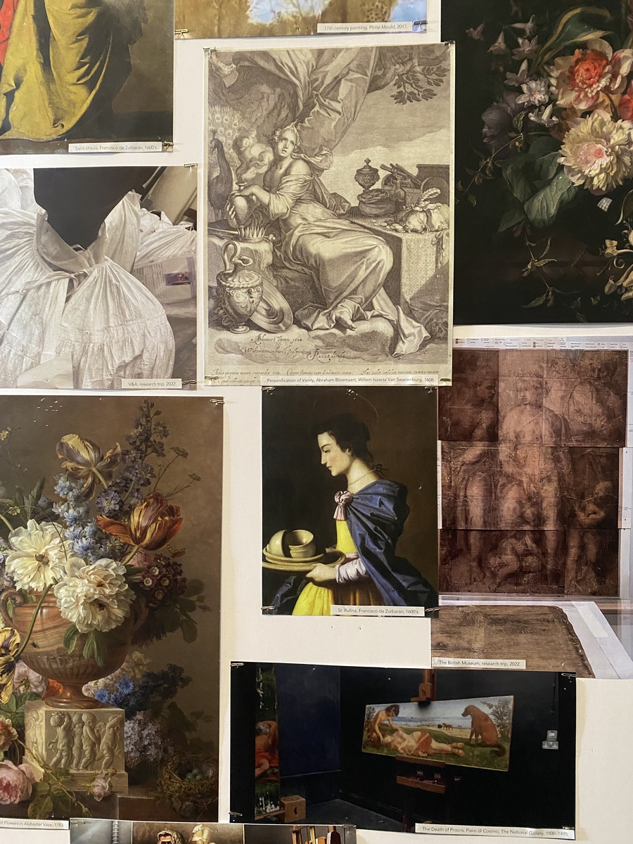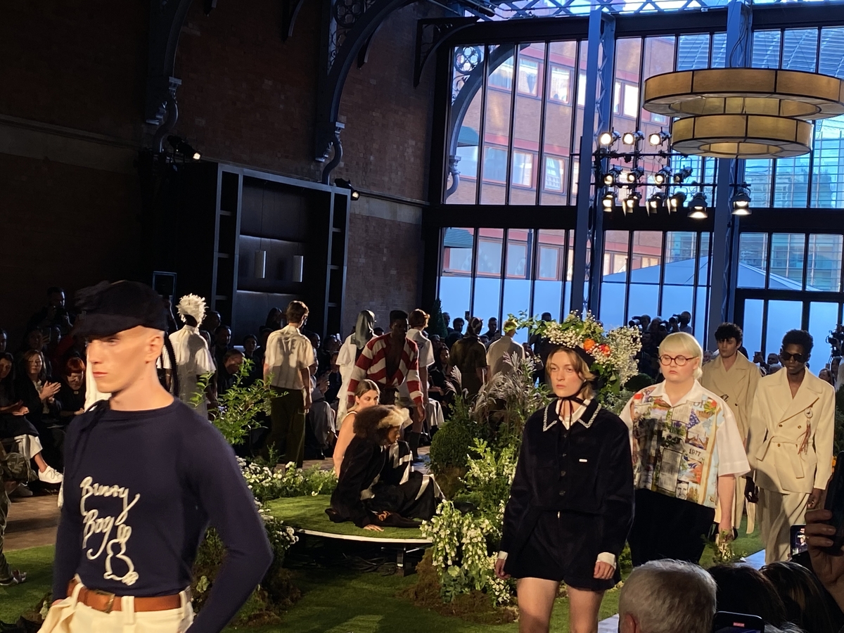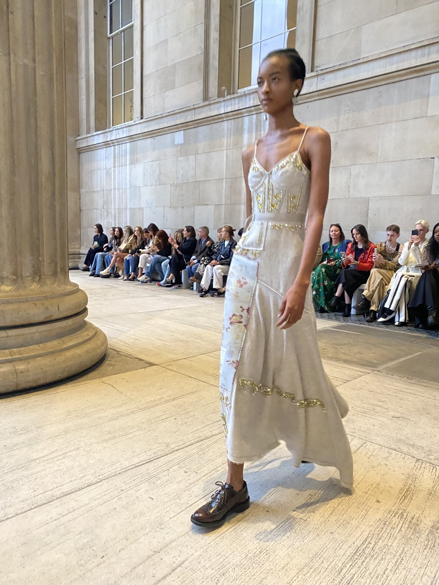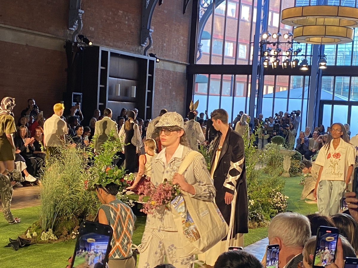 今季は、セントパンクラス・ルネッサンス・ホテル(St. Pancras Renaissance Hotel)の中に本物の草花で庭園を作って会場セットにした。着想源は、イギリスの社交界の名士で作家のヴィタ・サックヴィル=ウェスト(Vita Sackville-West)とヴァイオレット・トレフューシス(Violet Trefusis)の装いと生き様だという。彼女らはともに男性と結婚しながらもクィアのカップルだった。二人が交わした手紙が、モデルとしてランウエイを歩いた役者によって演技を交えて読み上げられた。コーデュロイのタキシード、花柄プリントのトレンチコート、リボンの装飾を施した黒のモーニングコートなど伝統的なイギリスのユニフォームに付随する、時代と性別と階級の枠組みを軽やかに崩壊させた。アイリッシュリネンとシルクをパッチワークしたシャツや滑らかなリネンのセットアップは、工場で調達した余剰生地とデッドストックで構成したアップサイクル。生地のバリエーションに加え、ヘッドピースとバッグのアクセサリーも物語の脇役として活躍し、表現力に磨きがかかっていた。クリエーションとしてまだまだ余白がありそうで、今後が期待できる注目株だ。