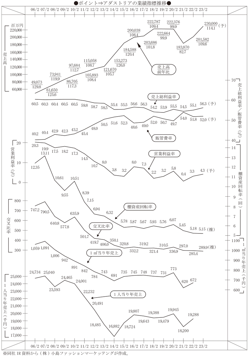11年2月期から取り掛かった垂直統合型SPAへの大転換も十余年を経て完成の域に達したはずだが、粗利益率は回復しても56.3%(23年2月期見通し)と、バイイングSPAのピークだった06年2月期〜10年2月期の60%台には遠いし、棚資産回転率も5回転強と07年2月期の13回転強の4掛けにとどまる。マーチャンダイジングの生産性指標たる交叉比率はピークの800近い水準から4掛け以下に落ち込み、近年は300を割っている。