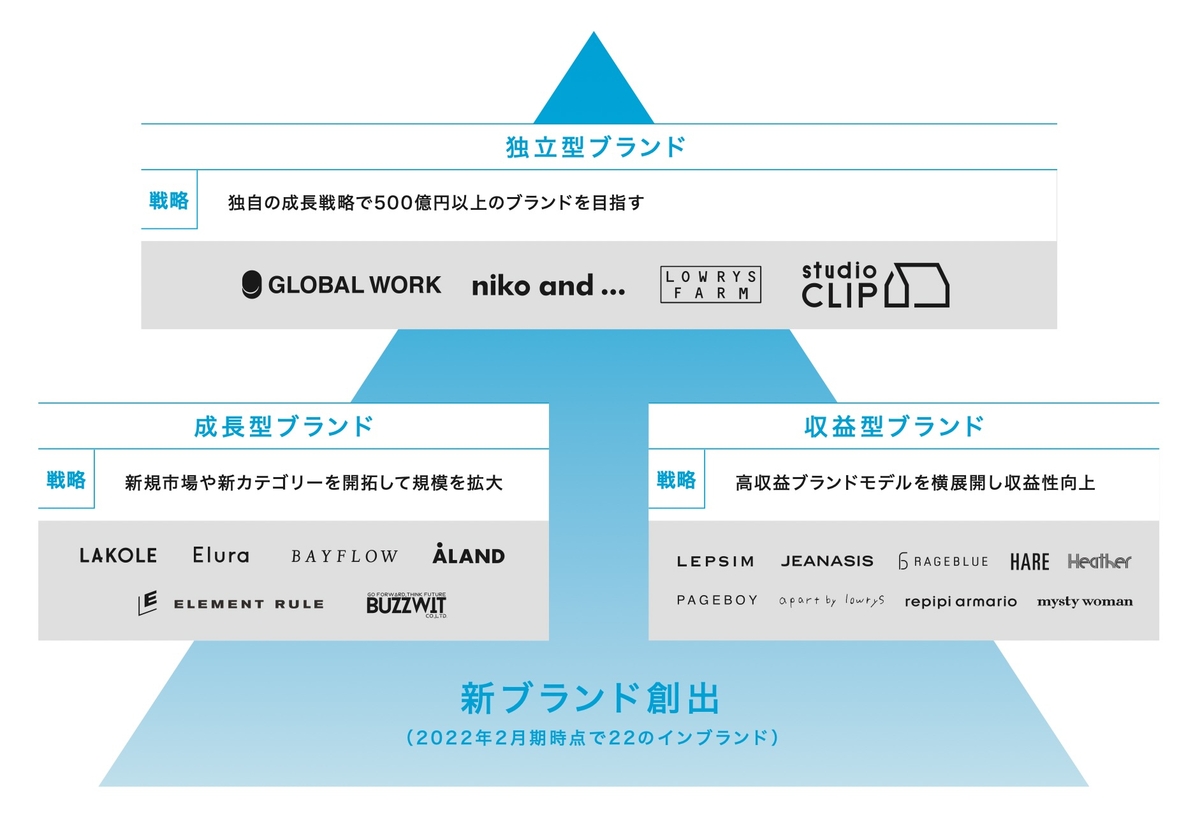 同社のブランド・ポートフォリオを見ても、垂直統合型化以前は駅ビル立地の収益型ブランドが先行し「ローリーズファーム」「グローバルワーク」の独立型ブランドが拡大する構図だったが、垂直統合型化以降は13年2月期に収益型ブランドの「レイジブルー」「ヘザー」「ハレ」が頭を打ち、17年2月期には「ジーナシス」「レプシィム」も頭を打ち、以降は独立型の「グローバルワーク」「スタディオクリップ」「ニコアンド」や成長型の「ベイフロー」が拡大し、むしろマスマーケット志向が強まっていった。