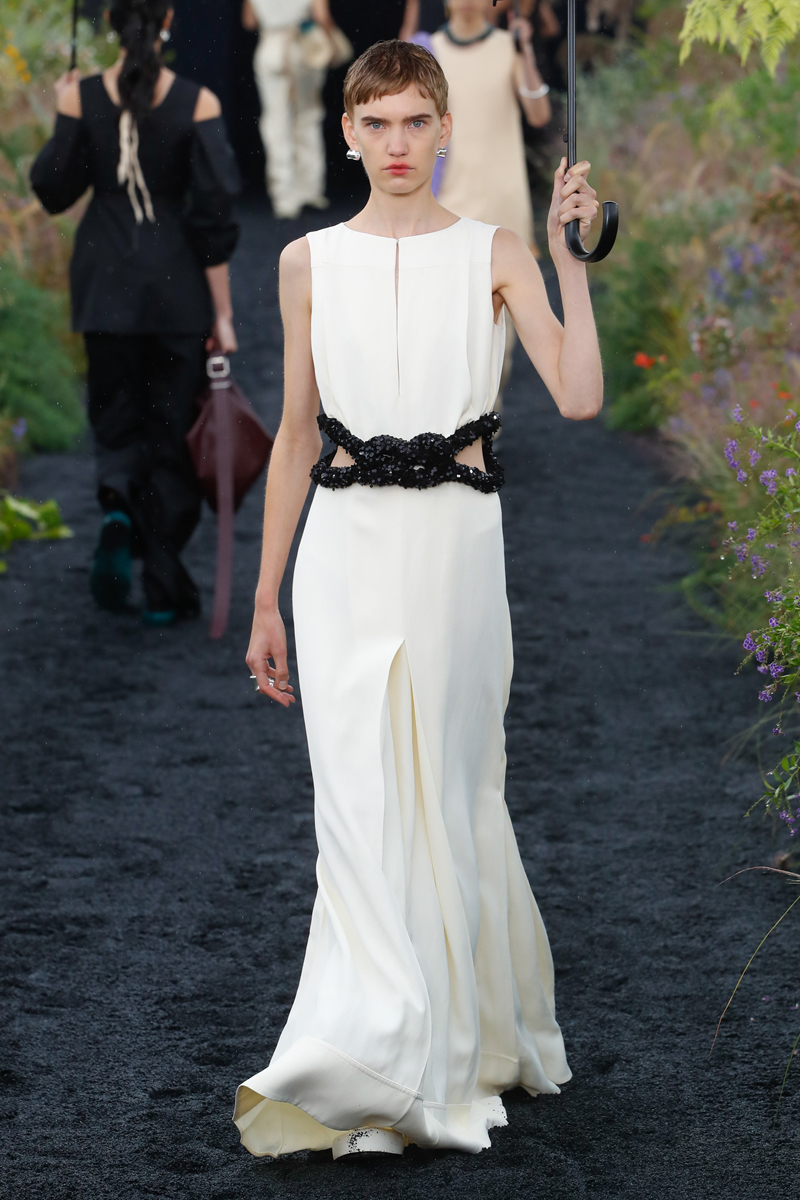 「ジル サンダー」のコレクションは本当に美しく、あいにくの雨ですらそれを損なうことはなかった。パステル調の柔らかな色味が黒い砂に覆われたランウエイに映えていて、目に心地よかった。さまざまなタイプのフリンジ、カットアウト、スパンコールなど、テクスチャーでの遊びを、美しいテーラリングと組み合わせるバランス感覚が素晴らしい。羽根やメタリックなパーツをあしらったウエアやアクセサリーなど、目を奪われるピースも多くて楽しめた。
