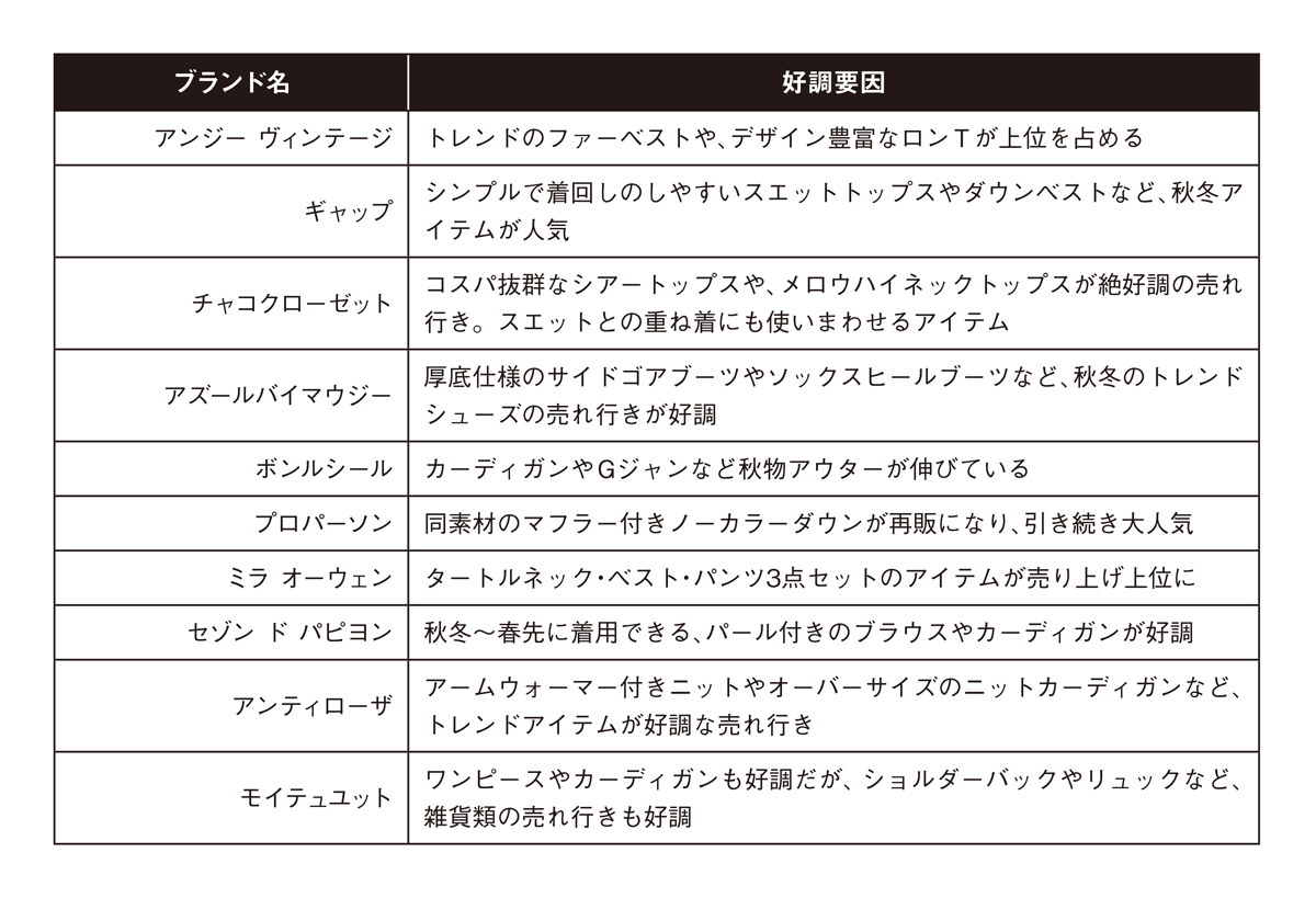 トレンドのケープコートは上品さとフェミニンな印象となり人気。付け外し可能な2WAYタイプが上位に並ぶ。スエットはメンズライクなオーバーサイズが人気。体型もしっかりカバーしてくれるのがうれしいアイテム。ラグランTシャツは肩が落ちた形状でリラックス感のある印象に。配色カラーが人気。一見スカート見えするパンツ(スカパン)はミニ丈でも安心して着用できる。