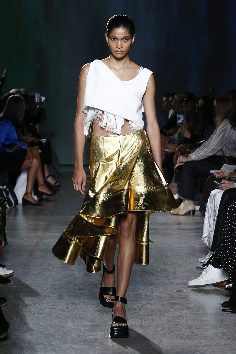 藪野:アウターは定番のアレンジが中心でしたが、テーラリングだと引き続きボックスシルエットが人気。合わせ方は、ブラトップやシャツ、ドレスなどさまざまです。バイカージャケットは、レーシングユニホームを想起させるシングルライダースのデザインが新鮮でした。先シーズンあたりから会場外のストリートスナップでよく見るようになり気になっていましたが、今季のランウエイではラグジュアリーメゾンから若手ブランドまでが提案していましたね。スカートやドレスでは、フリンジやプリーツ、ラッフル、アシンメトリーなデザインで、ドラマチックなヘムラインを演出するデザインが目を引きました。