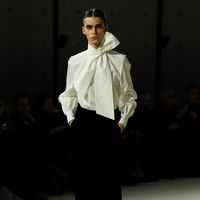 「プラダ」は今シーズン、「服の本質を見直そう」というテーマを掲げました。軸となるのはボックスのジャケットと、超タイトなトラウザーです。前シーズンに披露した1990年代風の合わせ位置の高いシャープなテーラリングに比べ、さらに要素を削ぎ落とした印象です。いつも以上にミニマルなクリエイションに徹した分、フェイクレイヤードのように襟だけ付いたギミックや、丸みのあるチャンキーシューズ、パンパンのパファージャケットのフォームなど、違和感が極端に際立ちます。MA-1やモッズコートは、極端にタイトだったり、オーバーサイズだったりと、同じアイテムを色やサイズ違いで繰り返すことでメッセージを訴えるという手法なのでしょう。ブランドのアイデンティティーであるユニホームから着想したチュニックと、短い丈のジャケットを合わせるスタイリングは秀逸。毎回楽しみしているインビテーションはクッションで、今回はクッションを服にアレンジしたピースが登場するという仕掛けでした。