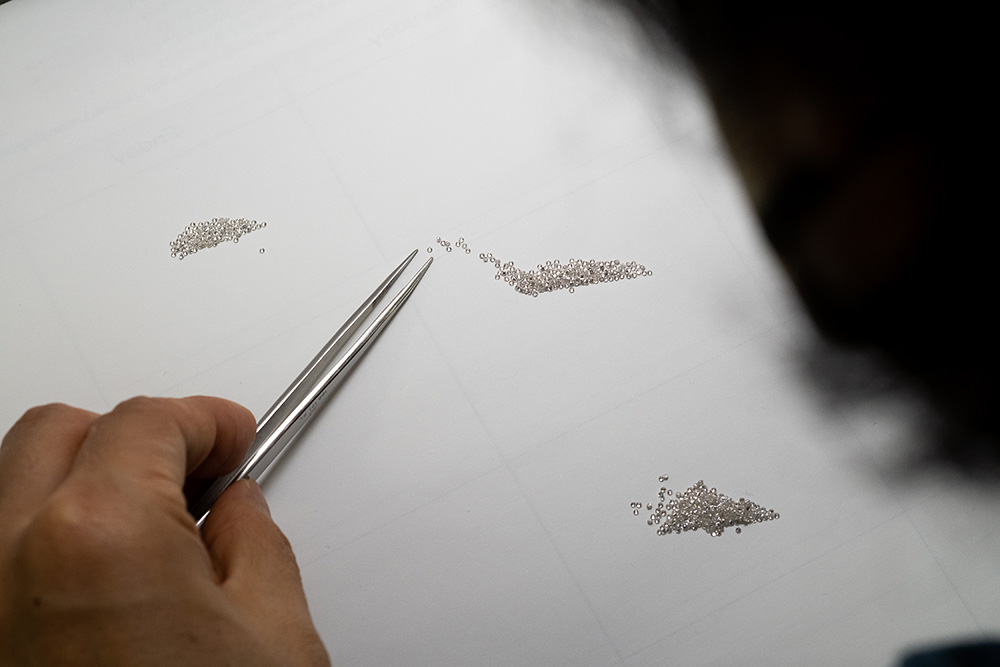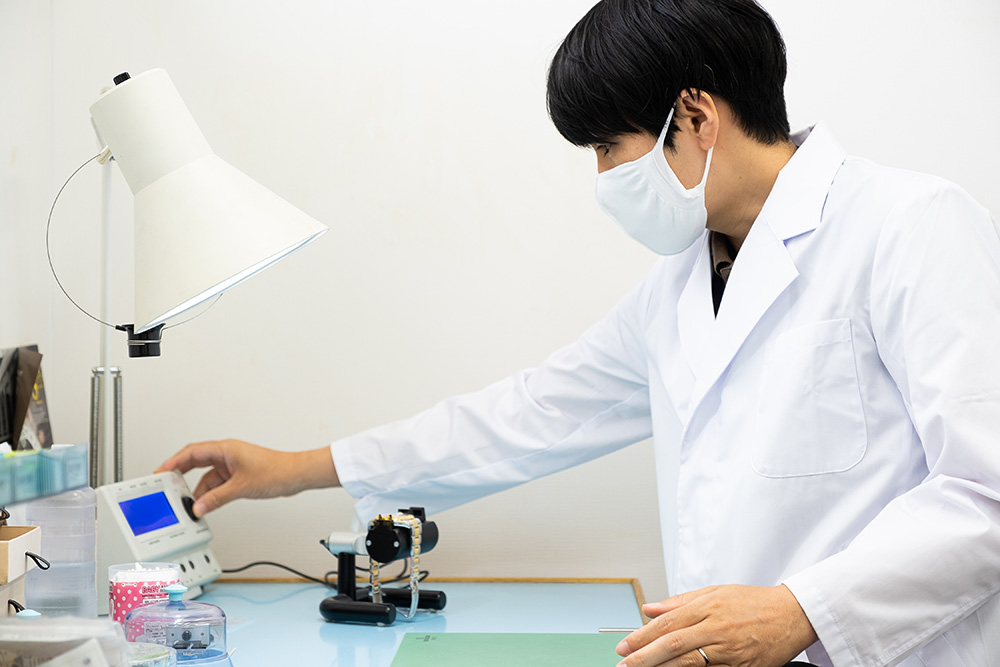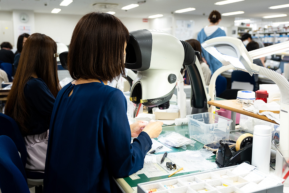 指輪やネックレスなどの宝飾品は、石の欠けや割れ、揺れ(はめ込みが甘い状態)といった微妙なコンディションが商品価値を左右する。デスクには特注の電子ルーペを設置し、スタッフが手作業で確認する。