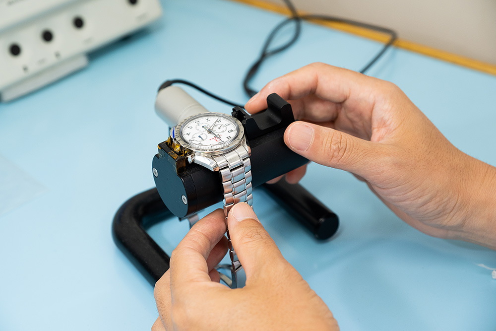 精密機器である時計は、特殊なコンディションチェックを行う。例えば機械式時計(自動巻き)は、内部のテンプの振動を専門の測定器で算出する。規定外のものは外部に修理を依頼し、簡易的な修理やオーバーホールは自社で行うこともある。