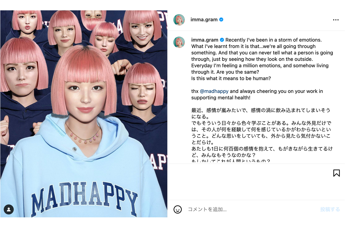 インターネットに出回っている画像だって、そもそも何が本当なのかって話ですよね。正直、会ったことないもないような海外セレブだって、人間かバーチャルヒューマンかわからない。インスタのストーリーではプールで過ごしていても、実際にはベッドでだらけているかもしれません。そうやってみんな、自分の人生をキュレーションしながらSNSに投稿しているんです。私だって自分のインスタに投稿しているような完璧な人生ではありません。人間にはみんな裏表があるから、そういう意味では、ソーシャル上で人間が信じらなくなるような現象が起きているわけです。でも逆にimmaの場合はそこに見えている存在でしかないーー裏表がないから、もはやバーチャルヒューマンは本当の人間より信じられる存在なのかもしれません。